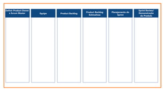 O documento discute os princípios e práticas do Scrum, incluindo definir o Product Owner e Scrum Master, criar o Product Backlog, realizar planejamento de sprints, revisões e demonstrações.