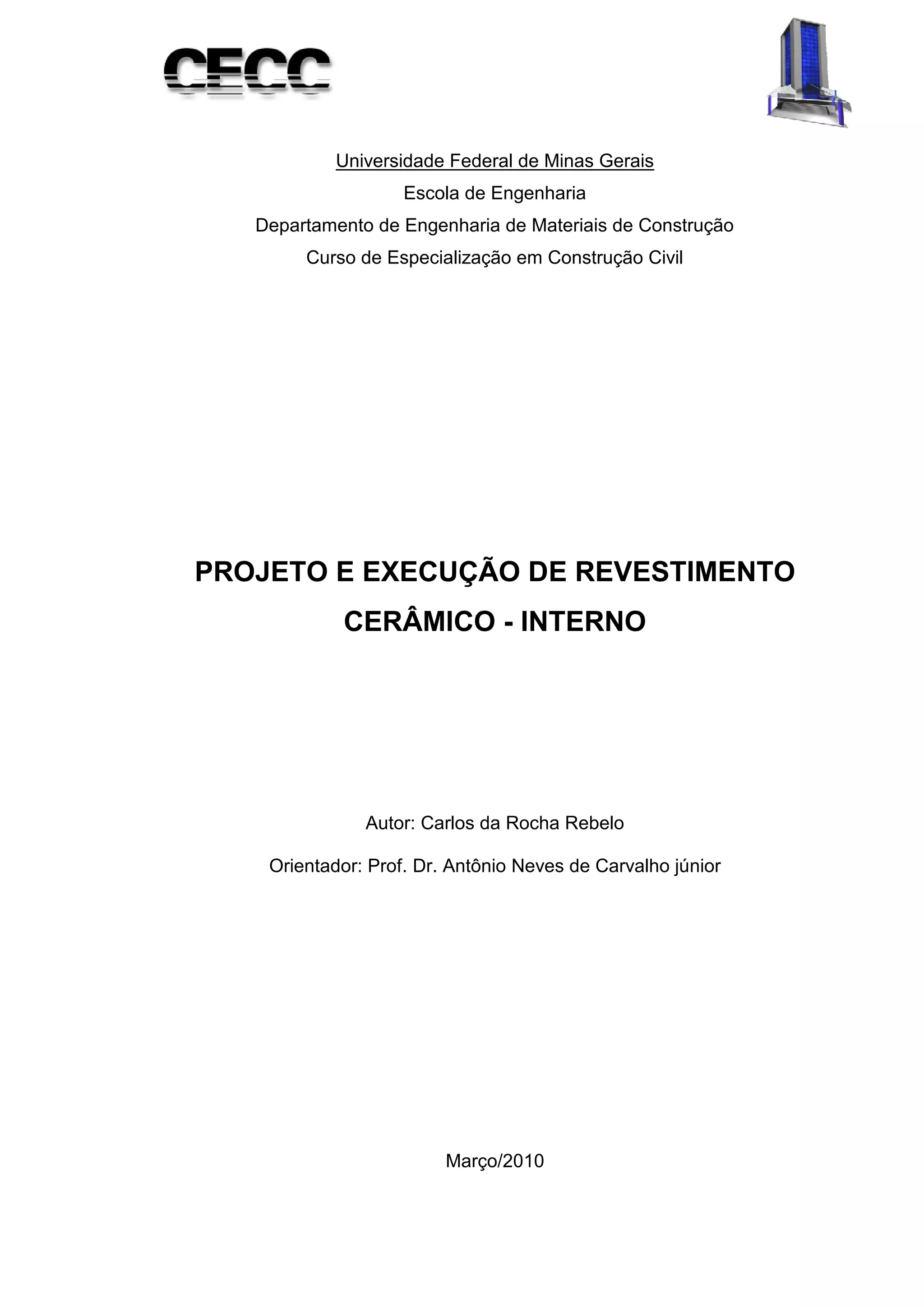 Este documento trata do projeto e execução de revestimento cerâmico interno. Primeiramente, apresenta conceitos sobre revestimento cerâmico, incluindo suas funções e propriedades. Em seguida, aborda o projeto de revestimento cerâmico, com parâmetros, considerações e desenvolvimento do projeto. Por fim, discute a execução do revestimento cerâmico, com planejamento, etapas, e controle da execução. O documento também apresenta patologias comuns em revestimentos cerâmicos.