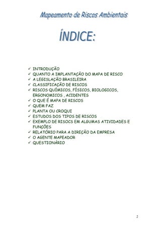 O documento discute o Mapa de Riscos no ambiente de trabalho, incluindo sua introdução e legislação, classificação de riscos químicos, físicos e biológicos, e como elaborar o mapa de riscos identificando esses riscos e medidas preventivas.
