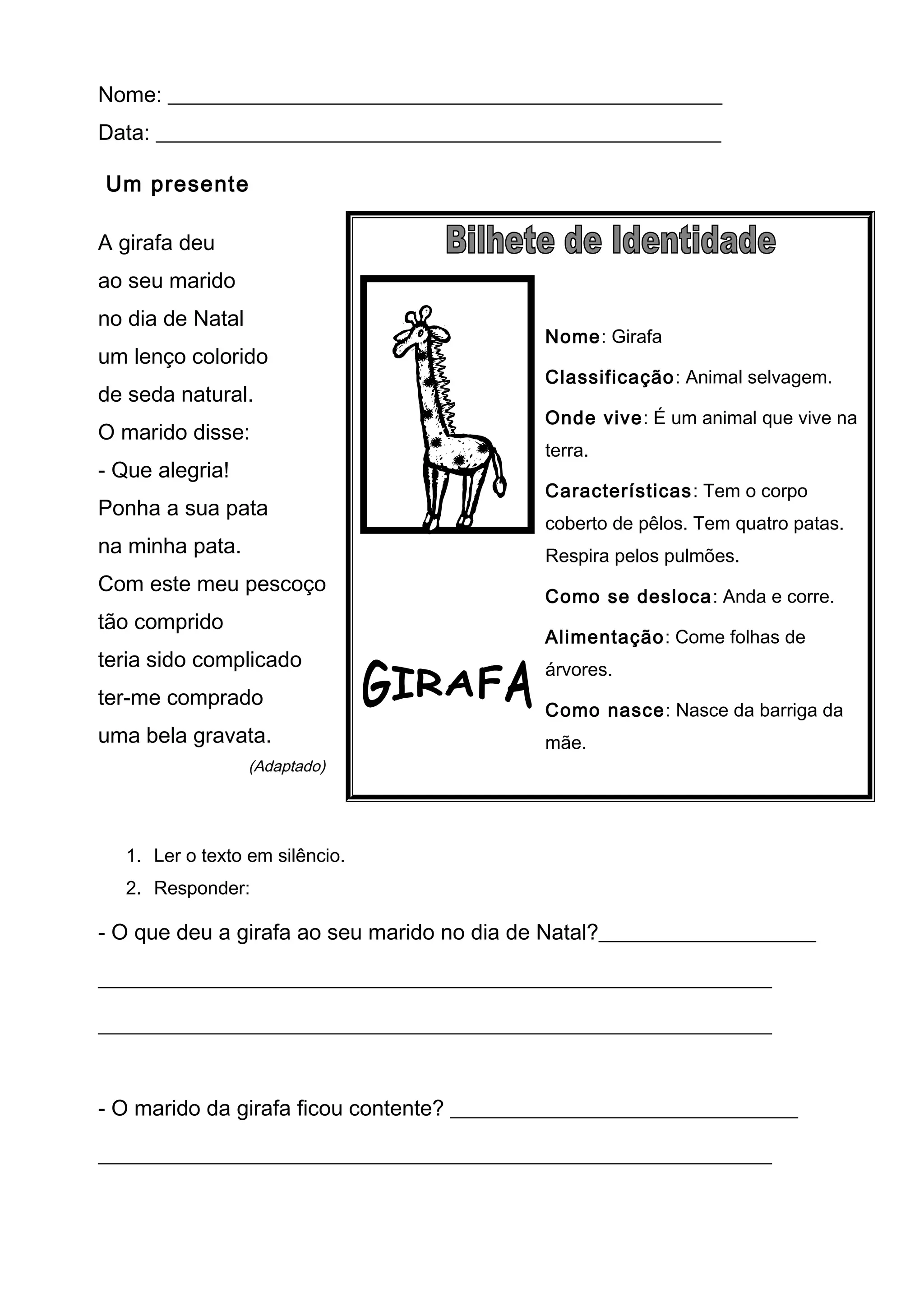 A girafa deu ao seu marido um lenço de seda natural no dia de Natal. O marido ficou feliz com o presente e disse que com o seu longo pescoço seria complicado usar uma gravata. A girafa é um animal selvagem que vive na terra, tem o corpo coberto de pêlos e come folhas de árvores.