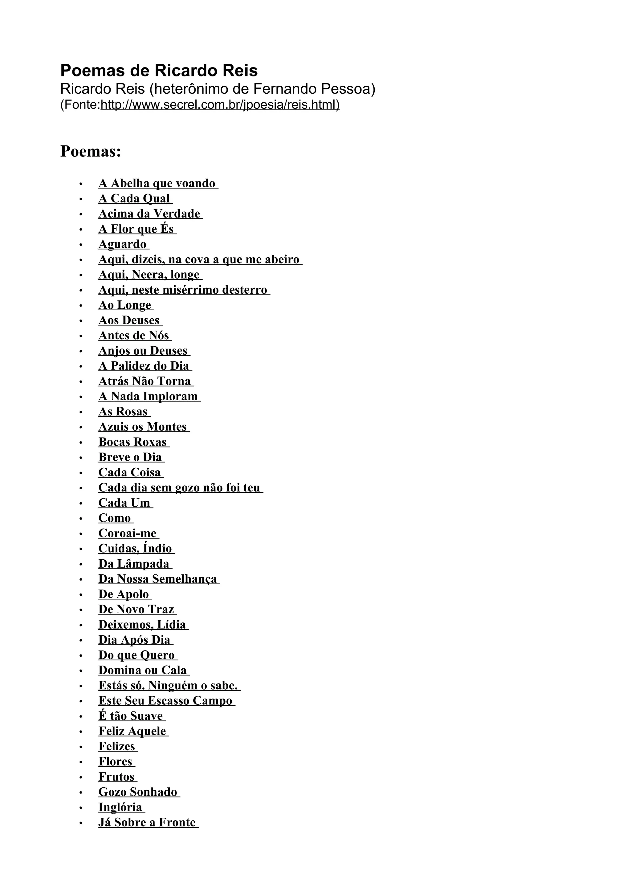Este documento lista e descreve vários poemas escritos por Ricardo Reis, um heterônimo do escritor português Fernando Pessoa. Os poemas abordam temas como a brevidade da vida, a busca pela liberdade e felicidade, e a relação entre os seres humanos e os deuses.