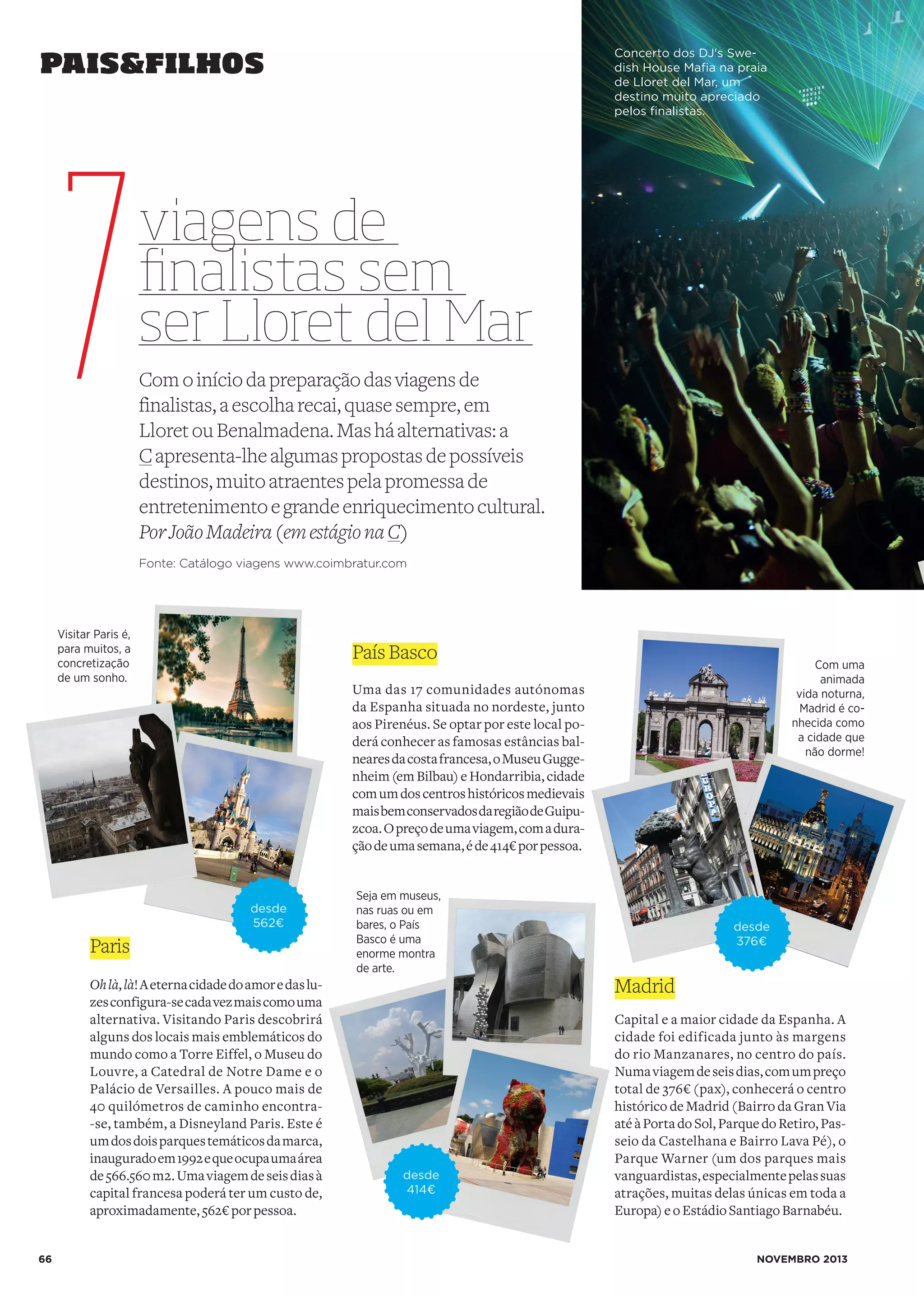 O documento fornece informações sobre viagens a três destinos populares para finalistas na Europa: Paris, País Basco e Madrid. Ele inclui detalhes sobre pontos turísticos em cada local, como a Torre Eiffel em Paris e o Museu Guggenheim no País Basco, além de fornecer estimativas de custos para viagens de 6 dias a cada destino.