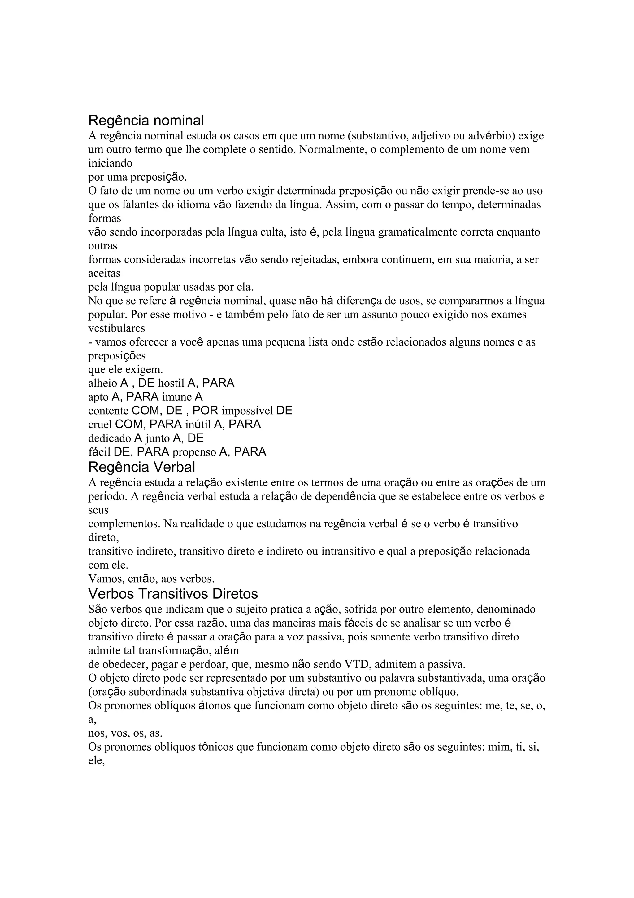 O documento aborda a regência nominal e verbal na língua portuguesa, explicando como substantivos, adjetivos e verbos se ligam a seus complementos por meio de preposições. Inclui exemplos de verbos transitivos diretos e indiretos, detalhando a relação entre os termos nas orações. Além disso, menciona a evolução do uso da língua e a diferença entre linguagem culta e popular.