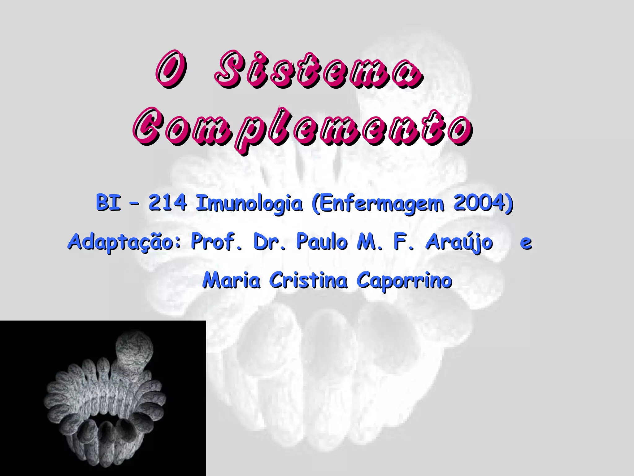 O documento descreve o sistema complemento, incluindo que ele é um conjunto de ~30 proteínas secretadas pelo fígado que atuam como mediador da resposta imune através de três vias de ativação distintas: a via clássica, a via alternativa e a via das lectinas. O sistema complemento regula a inflamação, opsonização e citotoxicidade de células, e deficiências no componente C3 podem levar a falhas na função fagocitária e maior susceptibilidade a infecções.