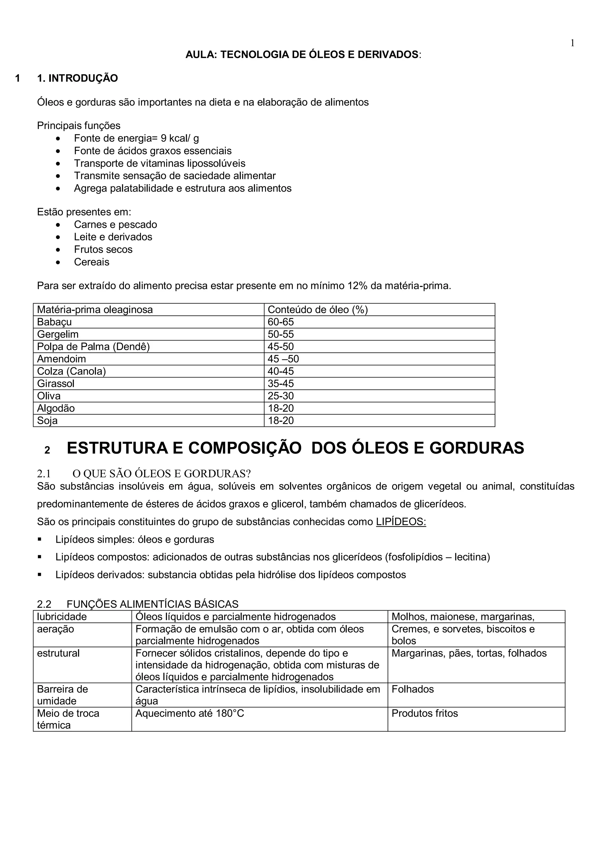 O documento discute os óleos e derivados, incluindo sua estrutura, composição e classificação. Óleos e gorduras são compostos por triglicerídeos formados por glicerol e ácidos graxos. Eles podem ser saturados ou insaturados e variam em sua composição de ácidos graxos de acordo com a fonte. Os óleos fornecem funções alimentares como lubrificação e barreira de umidade quando usados em alimentos.