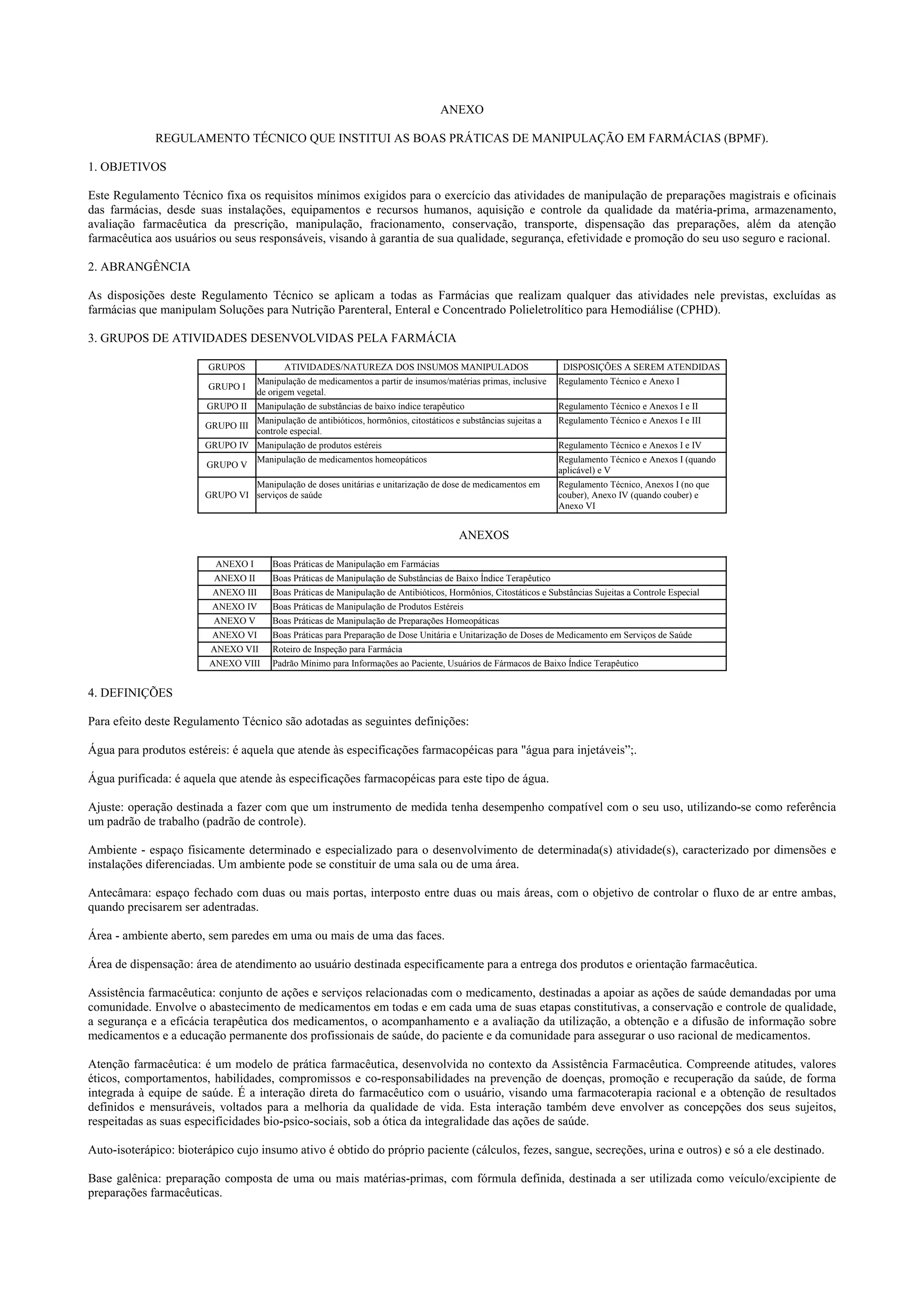 Este documento estabelece as Boas Práticas de Manipulação em Farmácias (BPMF) no Brasil, definindo requisitos para as instalações, equipamentos, pessoal, aquisição de matérias-primas, armazenamento, manipulação, dispensação e qualidade de preparações magistrais e oficinais em farmácias. É composto por um regulamento técnico e oito anexos que detalham as boas práticas para cada grupo de atividades e preparações.
