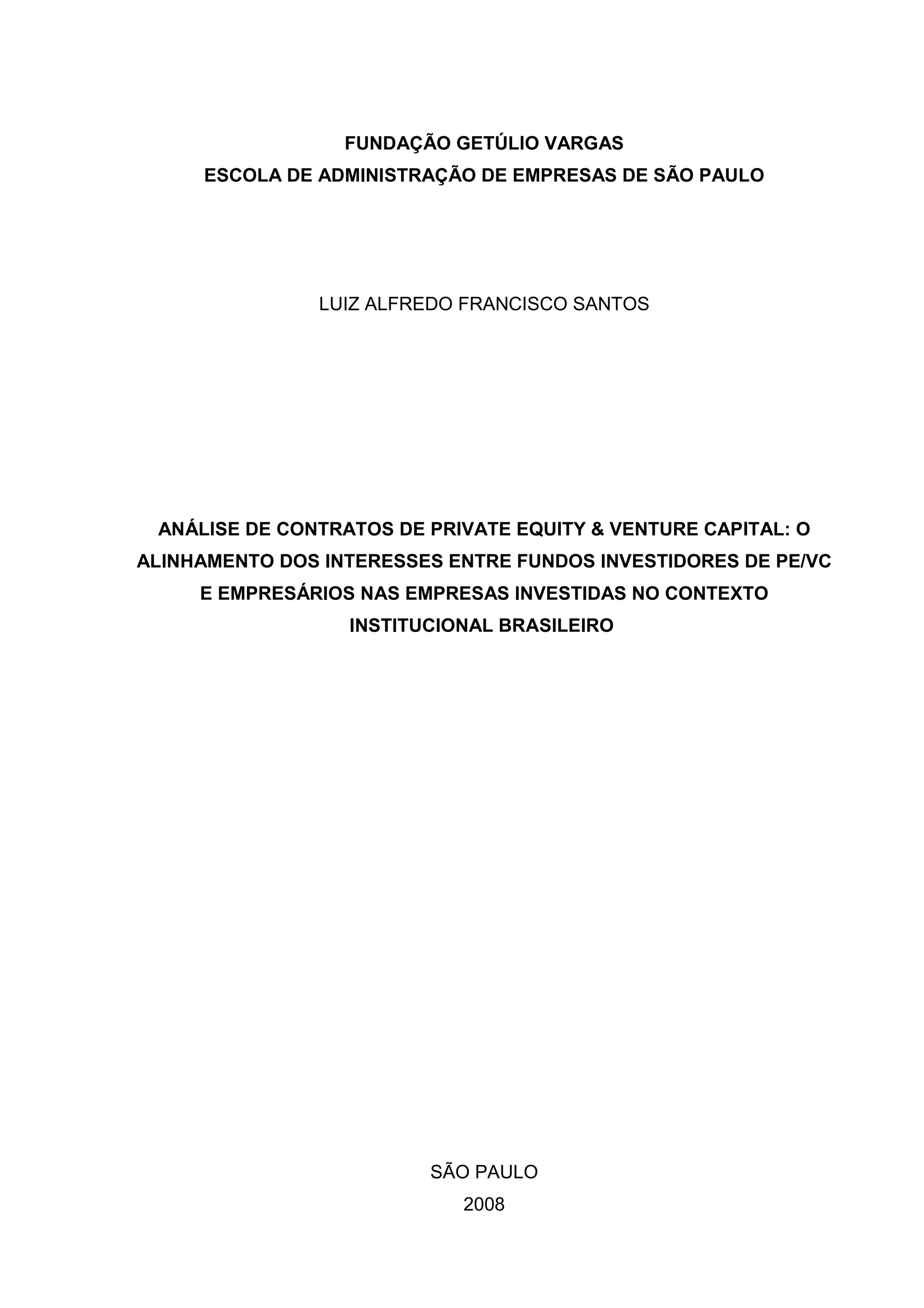 [1] O documento analisa os contratos de private equity e venture capital no Brasil, especificamente o alinhamento de interesses entre fundos investidores e empresários nas empresas investidas. [2] Avalia como o ambiente jurídico-institucional brasileiro pode afetar a negociação de contratos mais eficientes, comparando estruturas contratuais brasileiras e internacionais. [3] Inclui questionários com gestores de fundos para identificar percepções sobre limitações impostas pelo ambiente jurídico e qual estrutura contratual seria mais