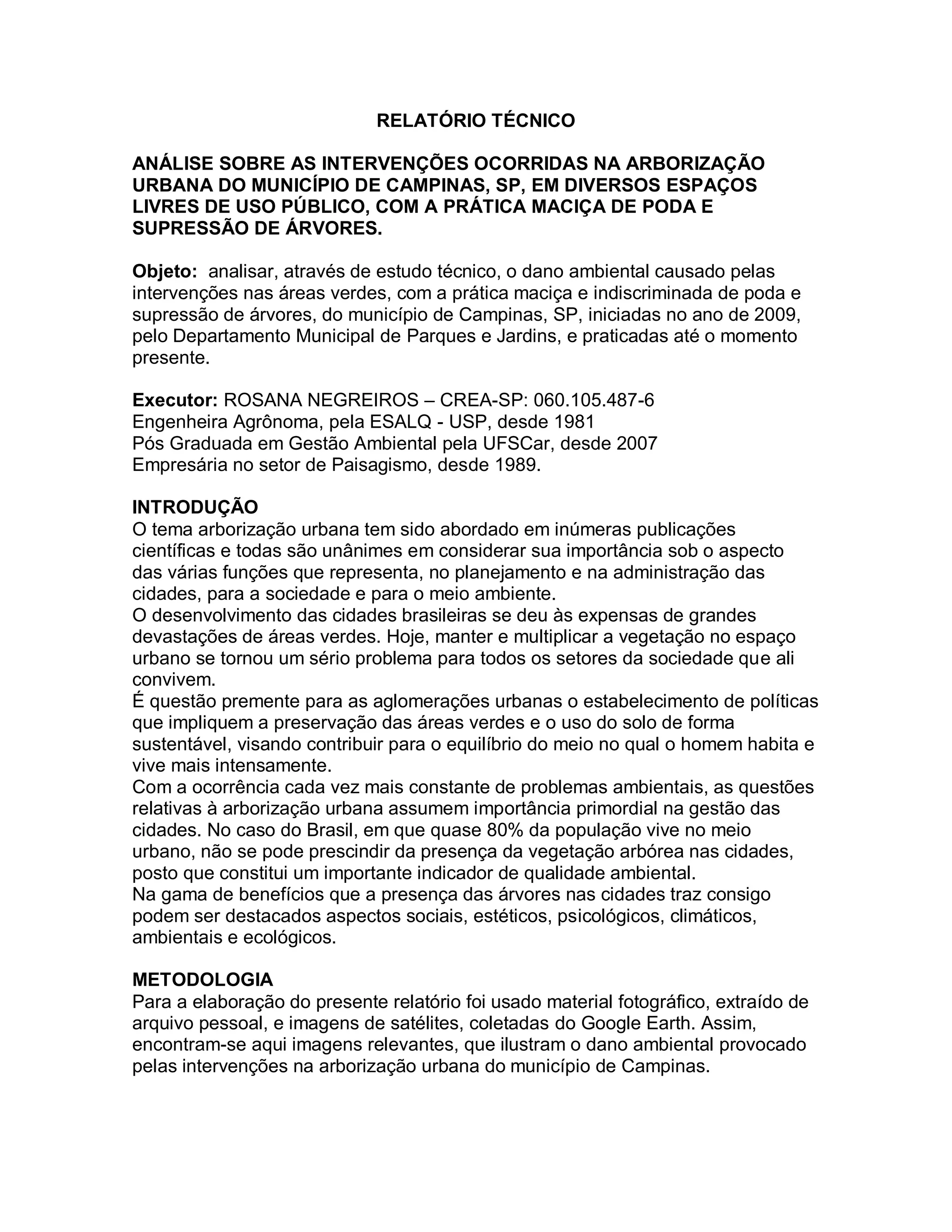 O relatório analisa os danos ambientais causados por intervenções maciças de poda e remoção de árvores em quatro áreas verdes de Campinas entre 2009 e o presente. Fotos antes e depois mostram a redução significativa do número de árvores adultas e do volume de copas. A poda drástica coloca em risco a saúde e estabilidade das árvores remanescentes e compromete os benefícios ambientais, sociais e econômicos proporcionados pelas áreas verdes.