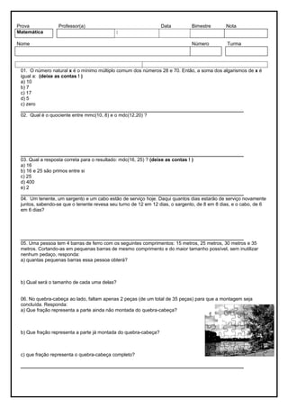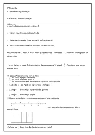 Este documento contém 15 questões sobre frações, números racionais e proporções. As questões abordam conceitos como mínimo múltiplo comum, máximo divisor comum, conversão entre frações e números mistos, identificação de frações próprias, impróprias e aparentes. Há também questões sobre proporcionalidade direta e inversa aplicadas a situações do cotidiano.