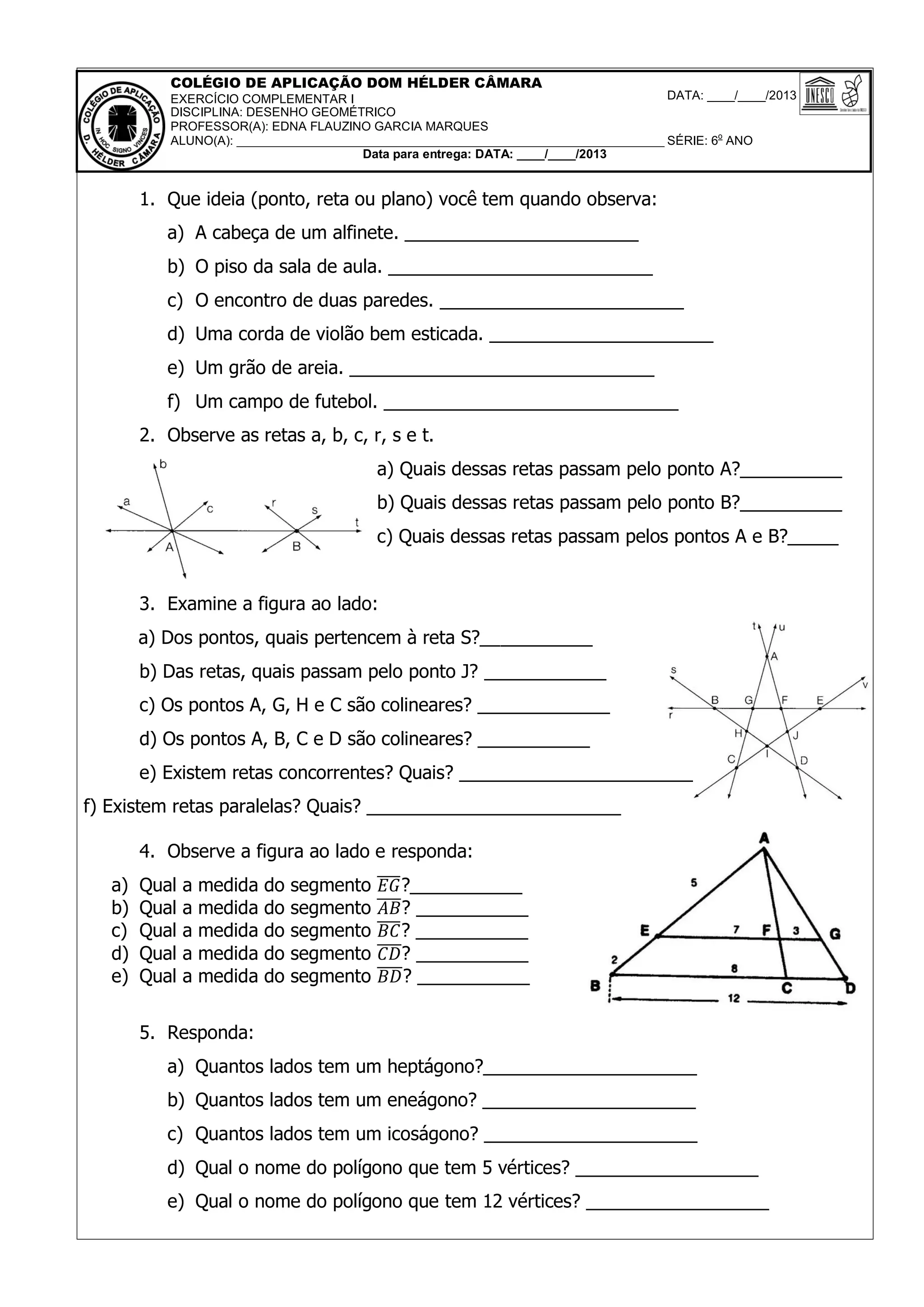 O documento é um exercício complementar de desenho geométrico contendo 10 questões sobre conceitos básicos de geometria como pontos, retas, planos, polígonos e ângulos. As questões abordam classificação de figuras geométricas, identificação de elementos geométricos em figuras e medidas de segmentos e ângulos.