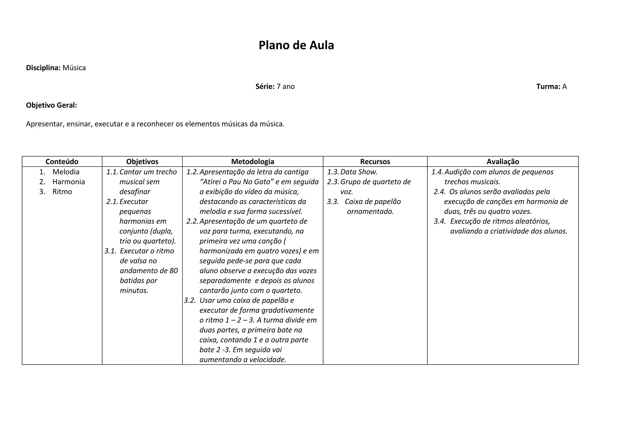 O plano de aula tem como objetivo apresentar, ensinar e reconhecer os elementos musicais da melodia, harmonia e ritmo. Os alunos irão cantar trechos musicais, executar harmonias em grupo e ritmos de valsa. As atividades incluem apresentações de músicas, vídeos e exercícios práticos com instrumentos.