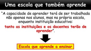 O documento discute como as escolas podem se tornar organizações que aprendem continuamente, com ênfase no trabalho colaborativo entre professores e gestores. Também enfatiza a importância de focar no desenvolvimento de competências dos alunos, como leitura, escrita e resolução de problemas, e articular o currículo com o mundo do trabalho.
