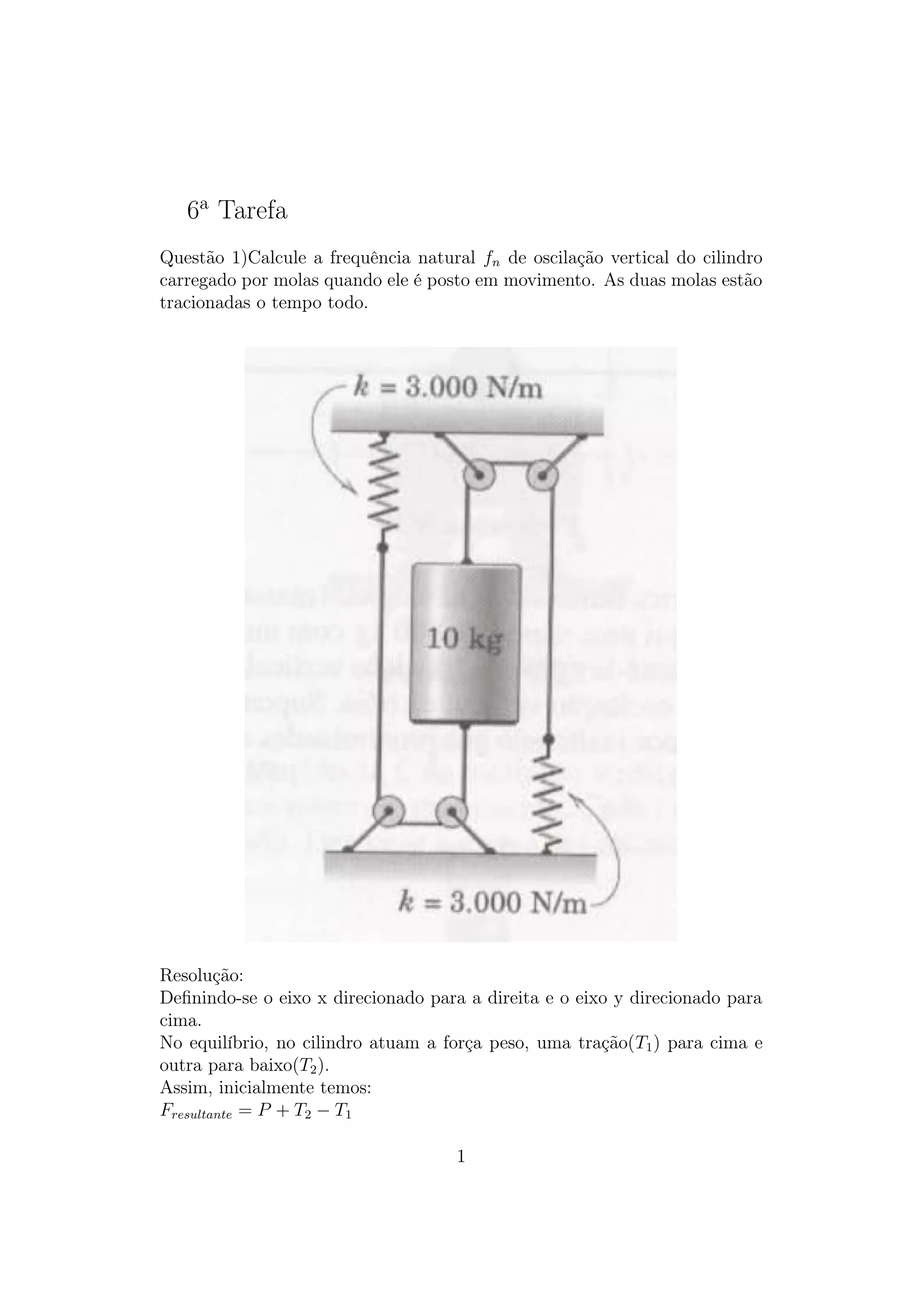 Este documento apresenta três questões sobre oscilações de um cilindro suspenso por molas. A primeira questão calcula a frequência natural de oscilação do cilindro. A segunda questão substitui duas molas por uma mola equivalente de forma a manter as mesmas frequências naturais. A terceira questão determina a constante máxima de mola aceitável para uma plataforma de pesagem com base em sua frequência natural máxima permitida quando descarregada e calcula a frequência quando carregada.
