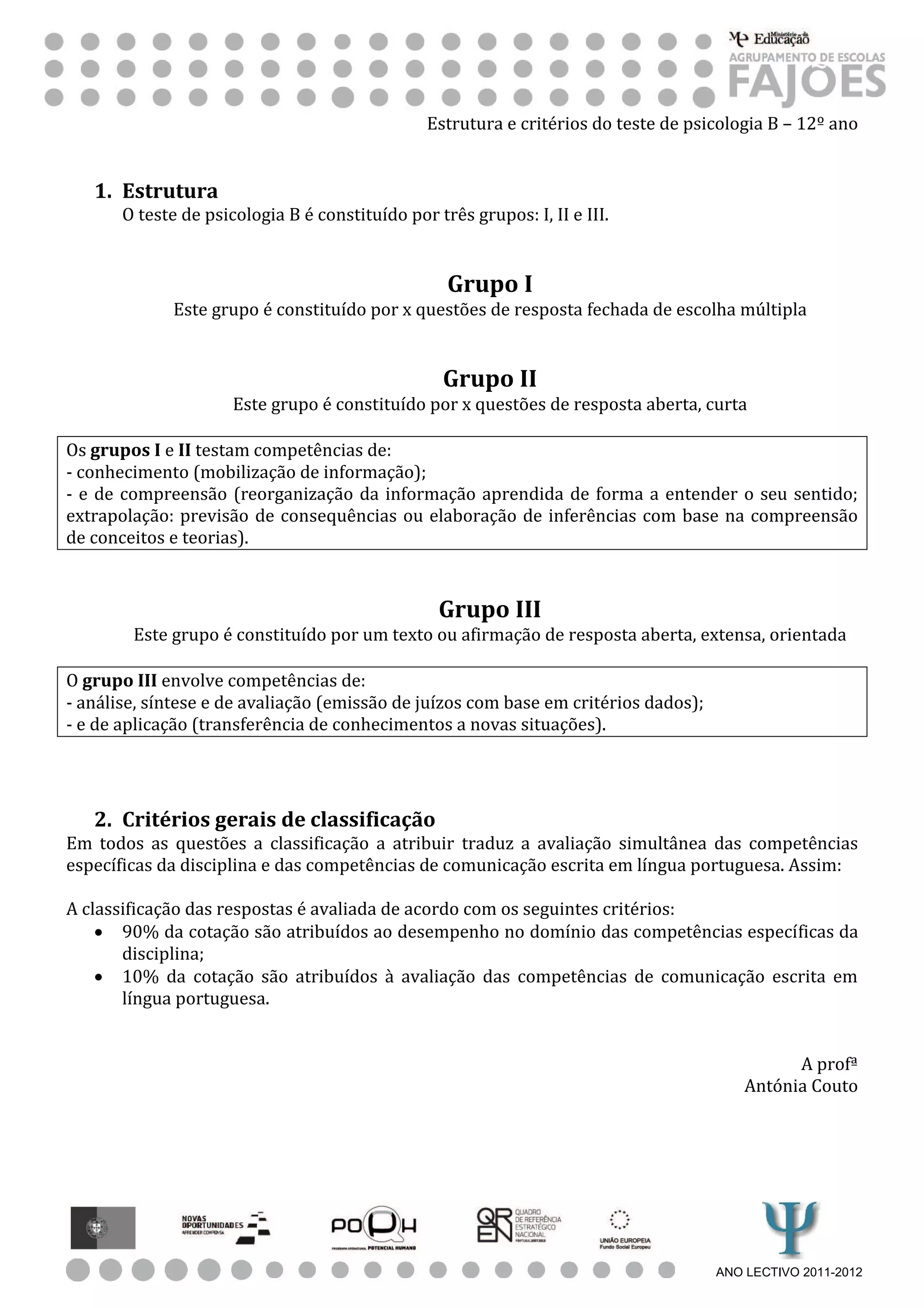 O teste de psicologia é constituído por três grupos que avaliam diferentes competências. O Grupo I contém questões de escolha múltipla sobre conhecimento e compreensão. O Grupo II contém questões curtas de resposta aberta sobre essas mesmas competências. O Grupo III contém uma questão longa de resposta aberta sobre análise, síntese e avaliação. A classificação das respostas é baseada principalmente nas competências da disciplina e parcialmente nas competências de comunicação escrita.