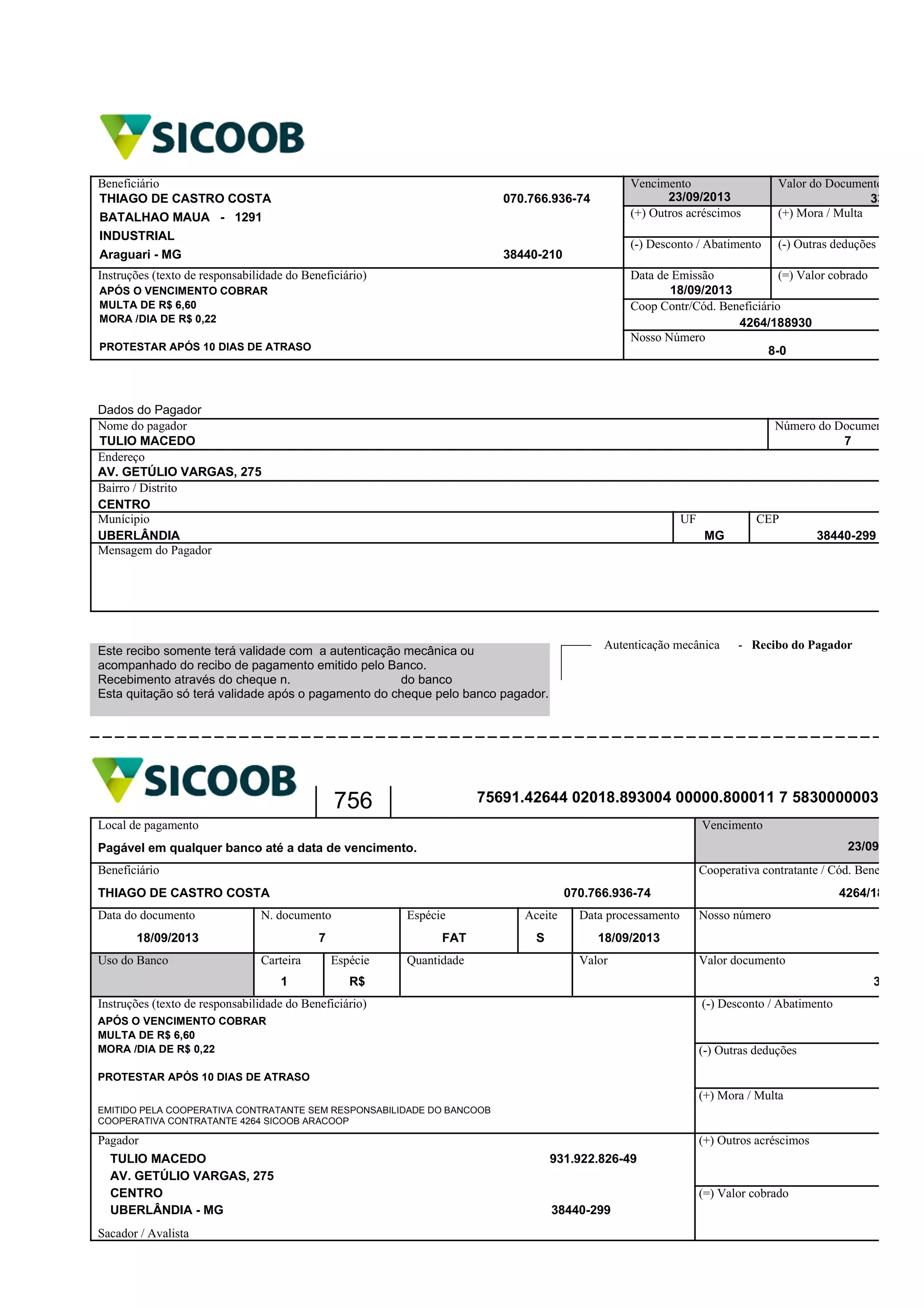 EMITIDO PELA COOPERATIVA CONTRATANTE SEM RESPONSABILIDADE DO BANCOOB