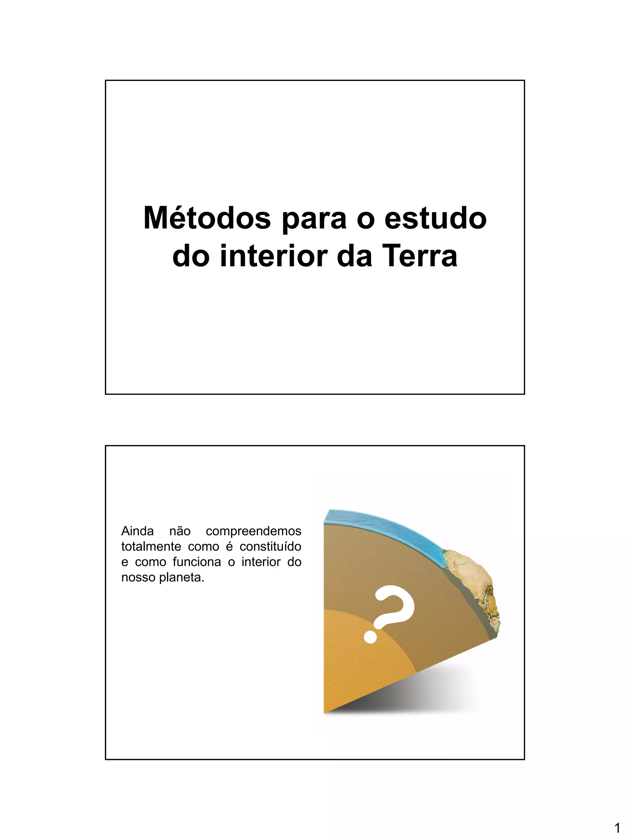 O documento discute métodos para estudar o interior da Terra, diretos e indiretos. Apresenta dois modelos para a estrutura interna da Terra, um baseado na composição química e outro nas propriedades físicas, descrevendo as camadas do núcleo, manto e crusta.