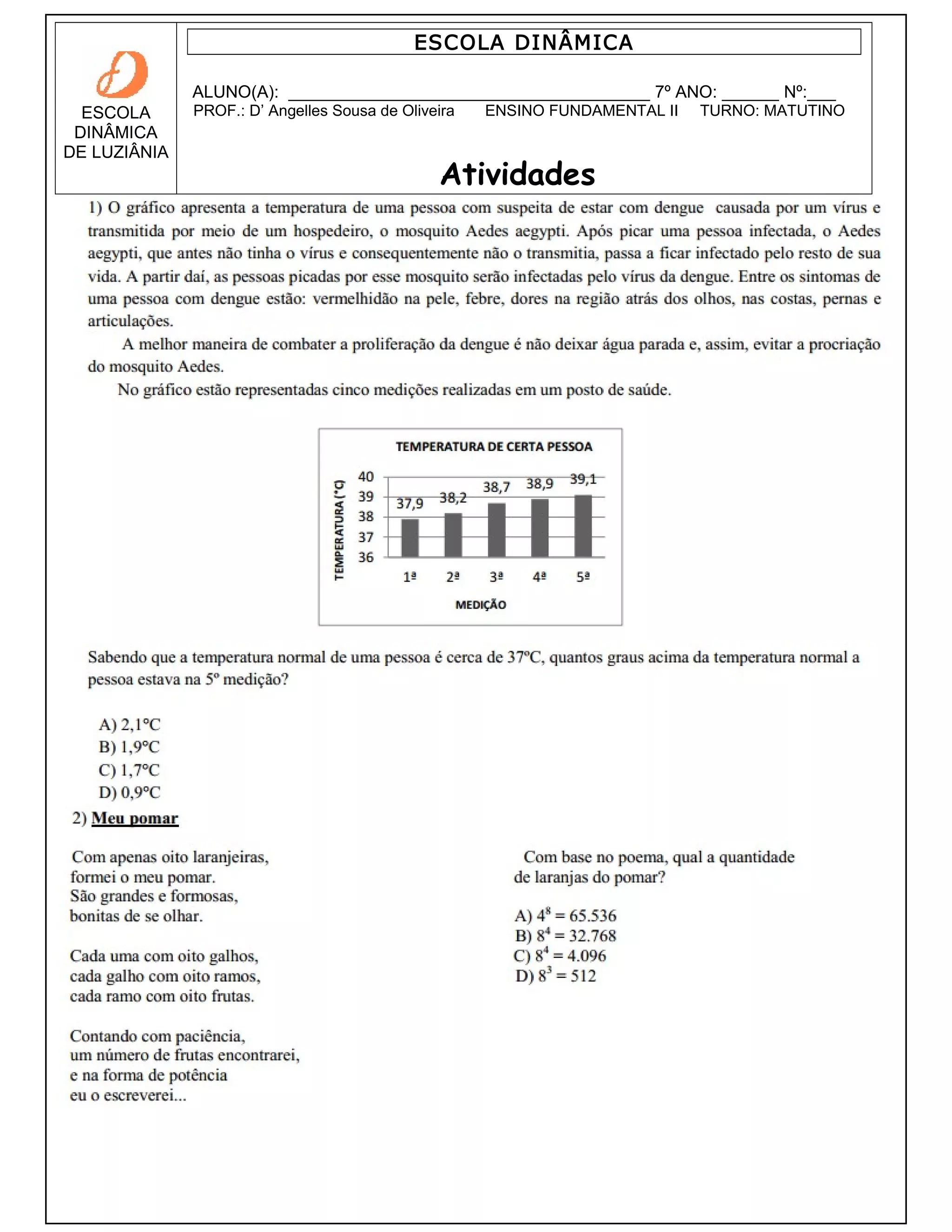 Este documento é um boletim escolar para um aluno do 7o ano da Escola Dinâmica de Luziânia no turno da manhã. Nele constam o nome do aluno, a série, o número de matrícula, o nome da professora e o nível de ensino fundamental.