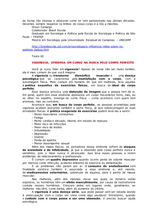 O documento discute a busca pelo corpo perfeito na sociedade contemporânea e seus efeitos nos adolescentes. A mídia promove padrões irreais de beleza que levam os jovens a desenvolverem distúrbios alimentares e a praticarem exercícios em excesso para atingirem um corpo idealizado. Isso pode resultar em problemas de saúde física e mental como a anorexia, bulimia e vigorexia.