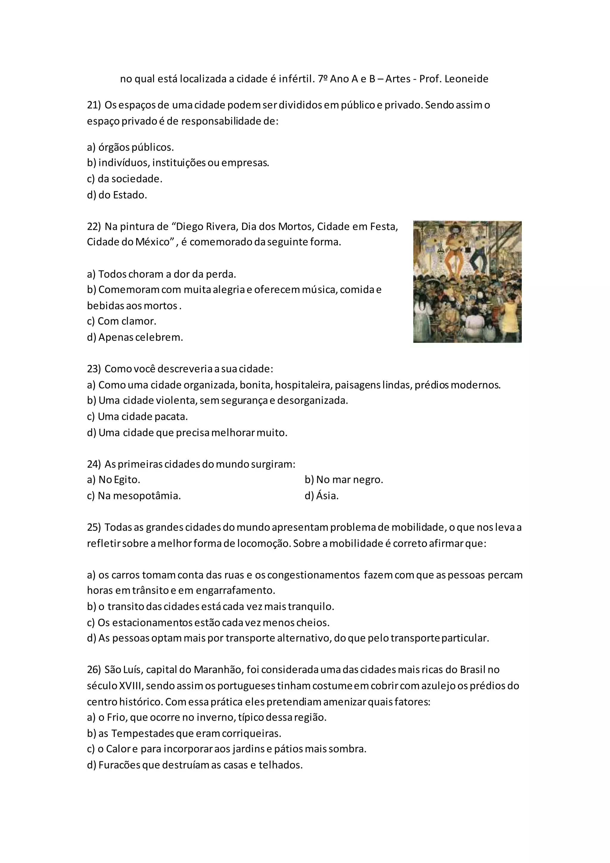 O documento discute vários tópicos sobre cidades, incluindo tipos de espaços públicos e privados, festividades comemoradas em cidades, características de cidades históricas como São Luís e Imperatriz, e desafios comuns em grandes cidades como mobilidade e poluição.