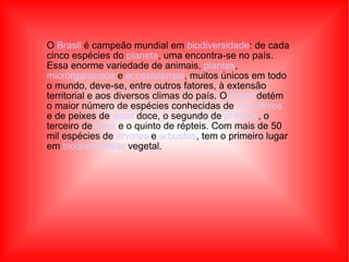 O Brasil possui a maior biodiversidade do planeta, com uma em cada cinco espécies globais encontradas no país. Isso se deve à extensão territorial e variedade climática do Brasil, que abriga o maior número de espécies conhecidas de mamíferos e peixes de água doce, e é líder também em biodiversidade vegetal com mais de 50 mil espécies de árvores e arbustos. O conceito de biodiversidade ganhou importância entre biólogos, ambientalistas e políticos a partir da década de 1980, em meio a