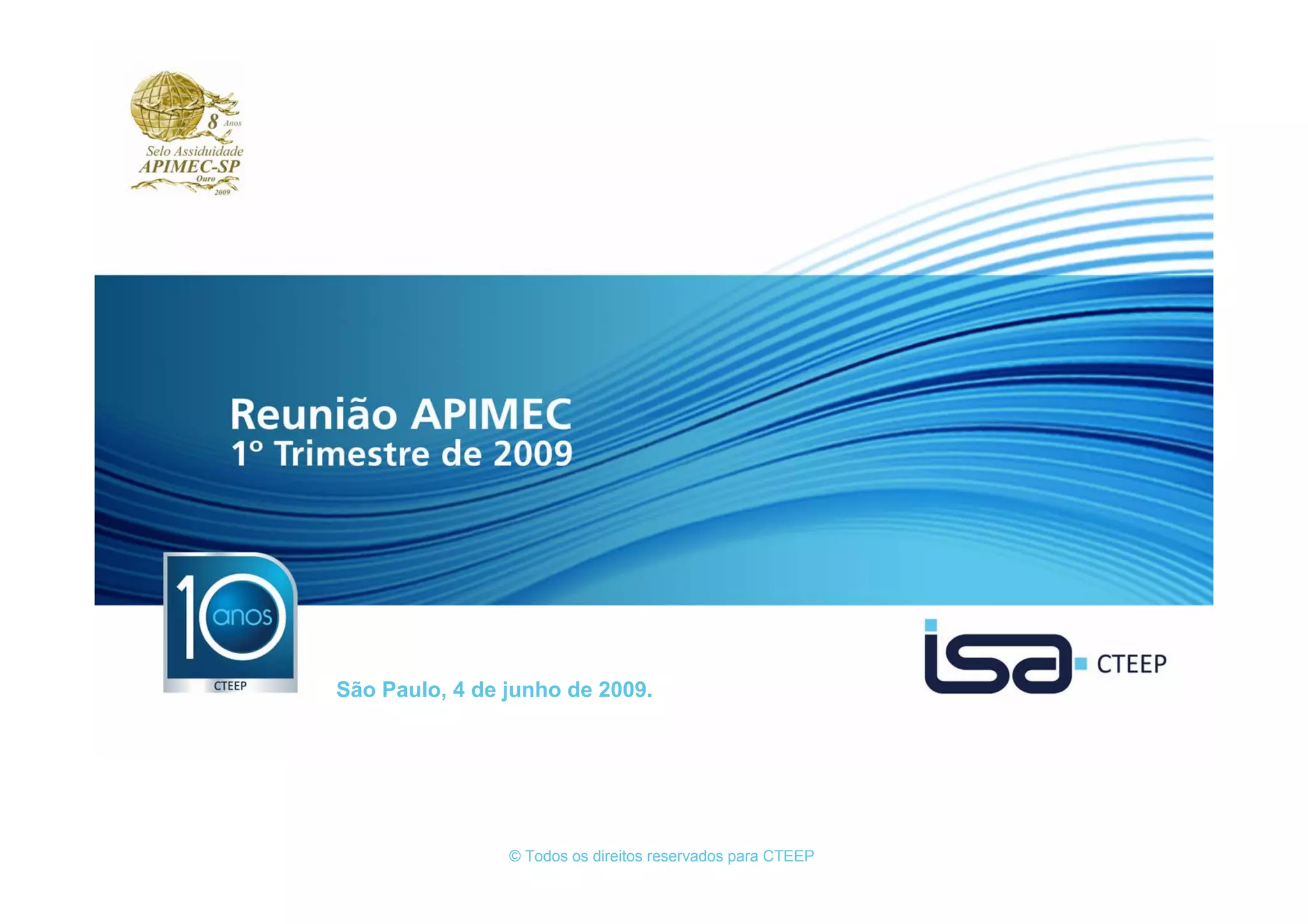 [1] A apresentação resume os resultados financeiros e operacionais da CTEEP no primeiro trimestre de 2009, com destaque para o crescimento da receita líquida e EBITDA. [2] Apresenta também as realizações da empresa em 2008, o cenário energético brasileiro, o desempenho operacional e a estratégia de crescimento do grupo ISA. [3] Fornece detalhes sobre novos projetos implementados e a entrada em operação da subsidiária IEMG no período.