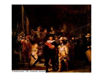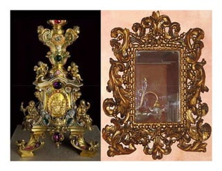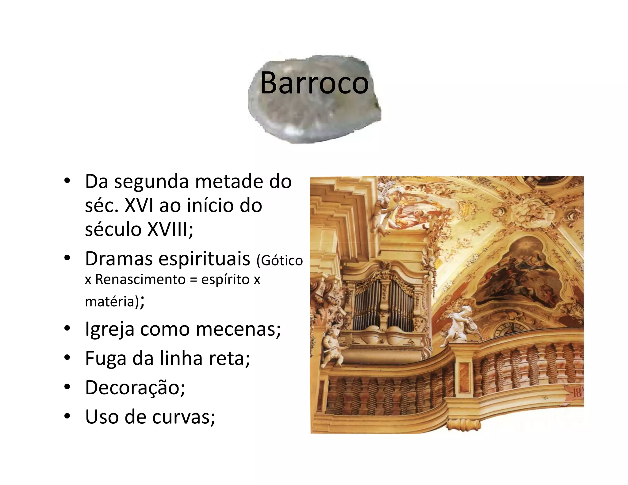 O estilo barroco surgiu entre os séculos XVI e XVIII, caracterizado pela ênfase na emoção, no movimento e no dinamismo expressos nas artes plásticas, arquitetura e literatura. A pintura utilizava composições diagonais, claros-escuros e muitas figuras, enquanto a escultura e arquitetura enfatizavam o movimento e as curvas. No Brasil, o estilo associou-se à religião católica e às artes decorativas em ouro.