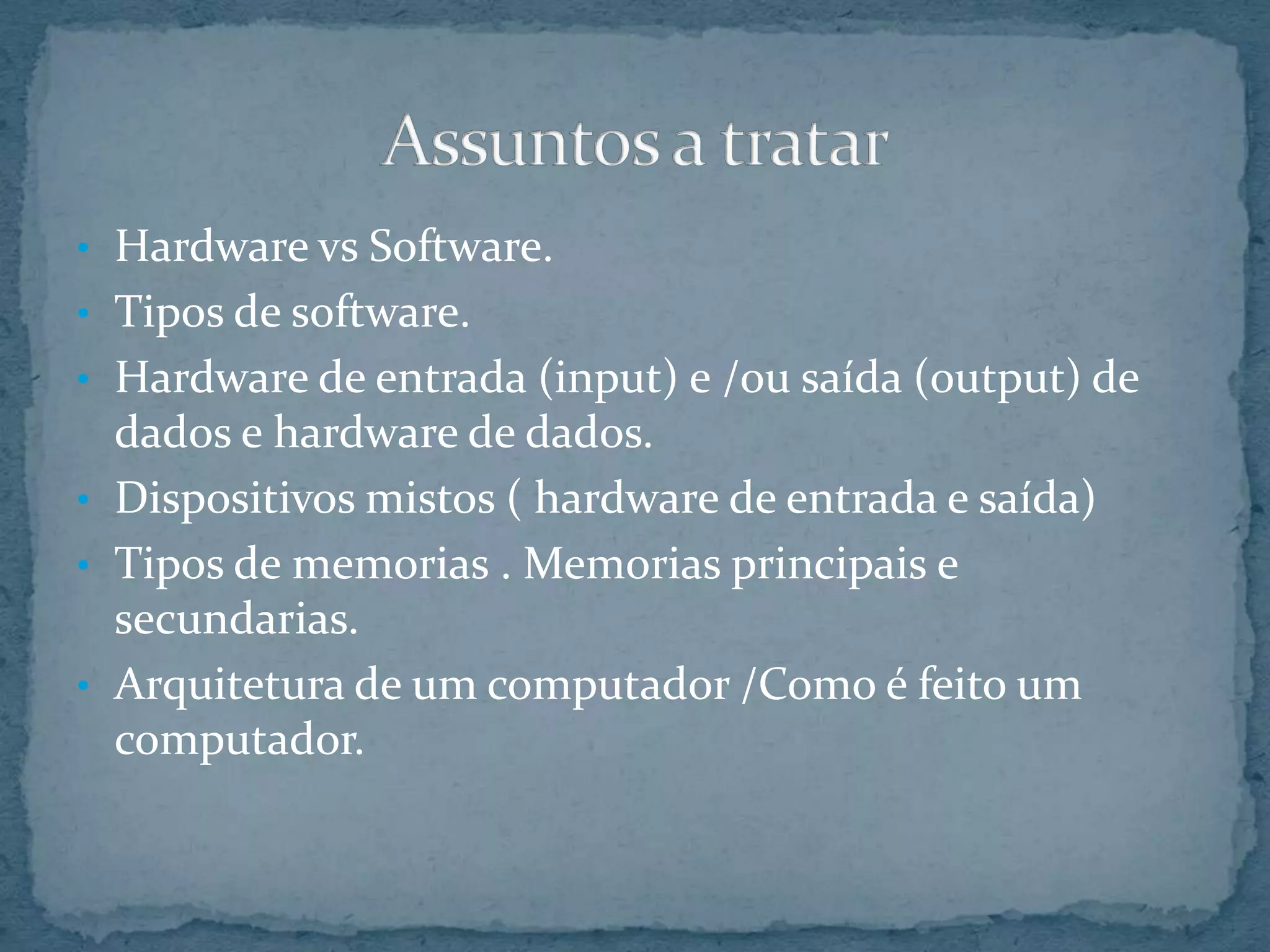 O documento discute a diferença entre hardware e software, tipos de hardware e software, memória principal e secundária e a arquitetura básica de um computador. Hardware refere-se à parte física do computador enquanto software refere-se à parte lógica. Memória RAM é volátil e armazena informações temporariamente, enquanto memória secundária armazena dados de forma permanente. Um computador é constituído principalmente por processador, memória RAM, disco rígido e placas.