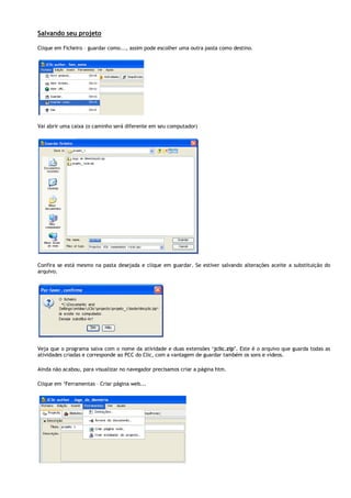 Este documento fornece instruções sobre como converter projetos desenvolvidos no Clic para o formato JClic, incluindo como abrir o arquivo Clic no JClic Author, fazer alterações, salvar o projeto no formato JClic e criar uma página HTML para visualização no navegador. Também explica como usar projetos JClic em computadores da escola.