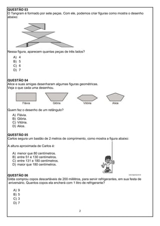 Este documento contém 19 questões de uma avaliação diagnóstica de matemática para alunos do 4o ano do ensino fundamental. As questões abordam tópicos como localização de itens em um mapa, reconhecimento de figuras geométricas, cálculos com unidades de medida e operações matemáticas básicas.
