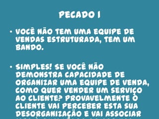 O documento lista 7 pecados comuns ao vender serviços de consultoria: 1) Não ter uma equipe de vendas estruturada, 2) A equipe não conhecer bem os produtos, 3) Não ouvir atentamente o cliente para entender suas reais necessidades, 4) Tentar vender serviços inadequados ao mercado do cliente, 5) Não investir em marketing e propaganda, 6) Cobrar preços inadequados, 7) Vender demais sem fechar o negócio.