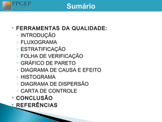 O documento descreve as principais ferramentas da qualidade utilizadas na metodologia Seis Sigma, incluindo fluxograma, estratificação, folha de verificação, gráfico de Pareto, diagrama de causa e efeito, histograma, diagrama de dispersão e cartas de controle. Estas ferramentas são usadas para coleta, processamento e análise de dados sobre a variabilidade dos processos com o objetivo de identificar problemas e reduzir defeitos.