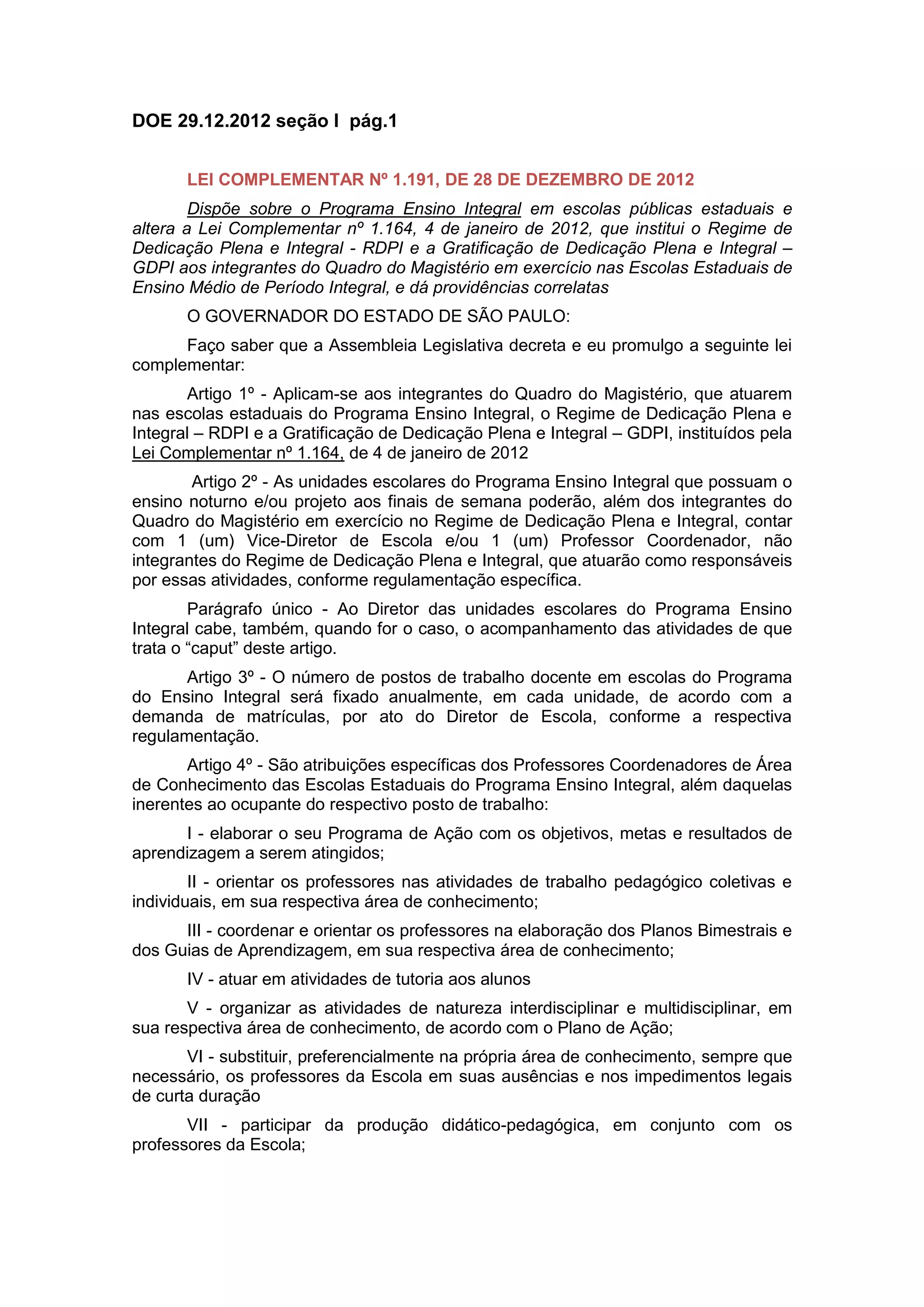 Este documento trata de uma lei complementar que estabelece o Programa Ensino Integral em escolas públicas estaduais e altera uma lei anterior sobre o Regime de Dedicação Plena e Integral. A lei define as atribuições de professores, coordenadores e diretores no programa e estabelece uma gratificação para os professores que participam do regime de dedicação plena e integral.