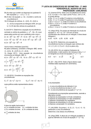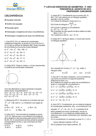 2) As questões envolvem cálculo de áreas de triângulos, equações de circunferências circunscritas e inscritas, pontos internos e externos a circunferências e tangência entre circunferências e retas.