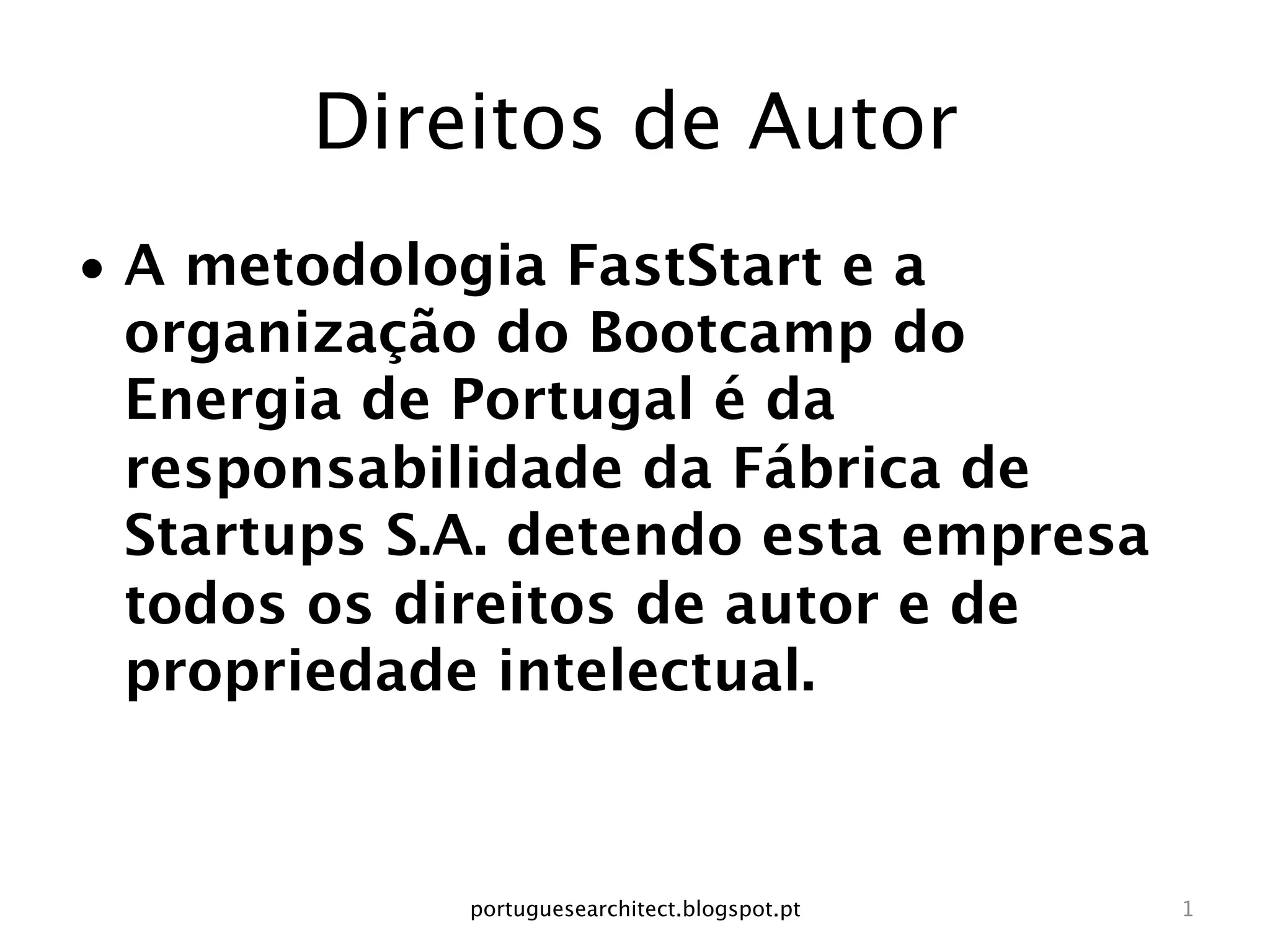Este documento descreve uma proposta de negócio para promover e internacionalizar arquitetos portugueses através de uma plataforma online. Apresenta informações sobre direitos autorais, membros da equipe, modelo de negócio, hipóteses testadas, tarefas realizadas, lições aprendidas e próximos passos.