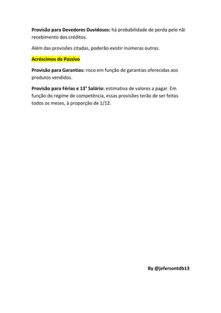 O documento discute reservas e provisões no balanço patrimonial. Explica que reservas são contas do patrimônio líquido, como reservas de capital provenientes de doações ou subvenções, e reservas de lucros. Provisões representam perdas ou despesas futuras, como depreciação, dívidas duvidosas, garantias e benefícios a pagar.