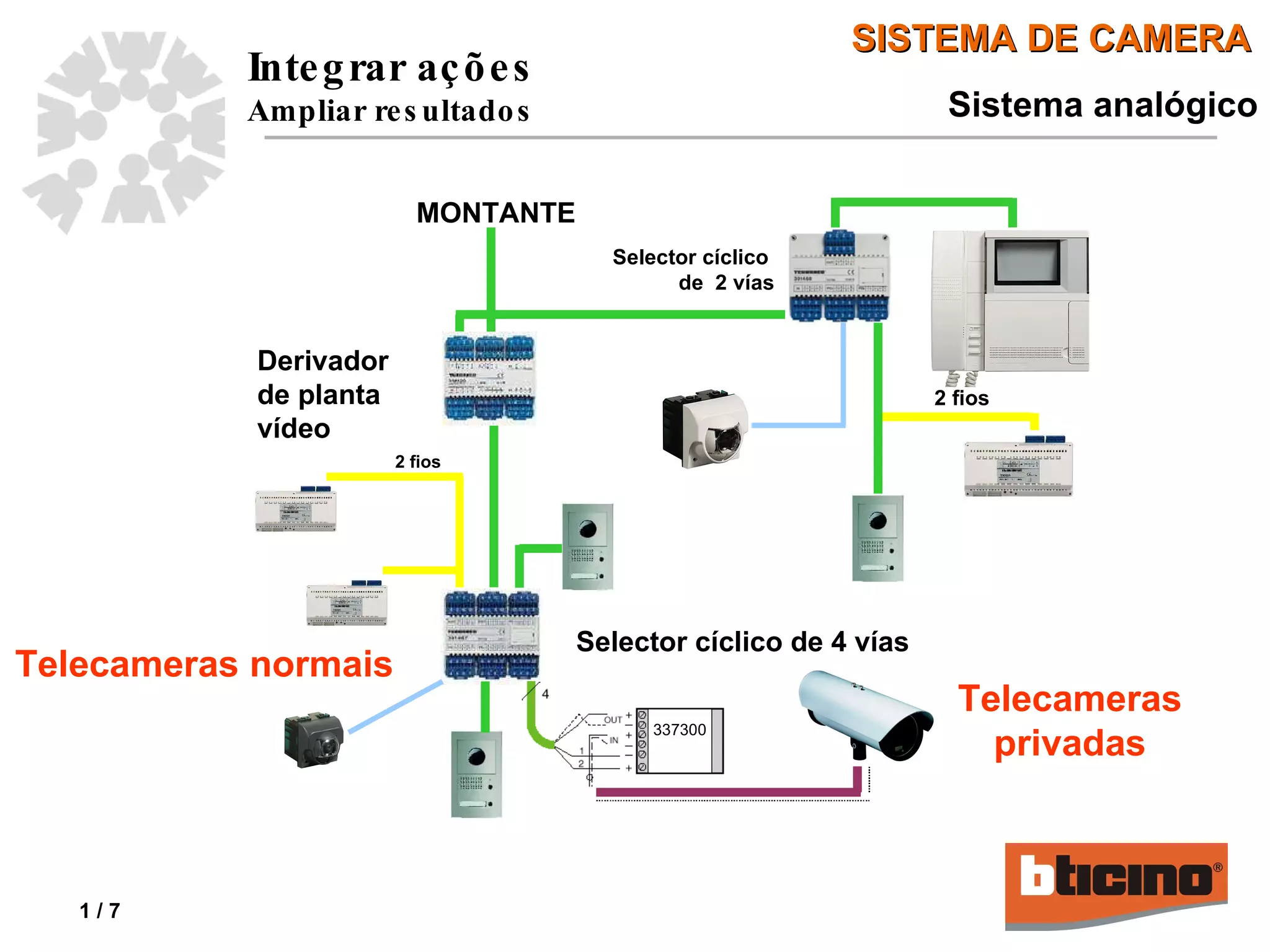 O documento descreve diferentes sistemas de vídeo (analógico e digital) e como ativar alarmes através de câmeras de vídeo nos sistemas. Ele discute seletores de vídeo de 2 e 4 vias, o número de fios necessários para diferentes configurações, e como usar contatos em câmeras e seletores para acionar alarmes, fechaduras elétricas ou luzes.