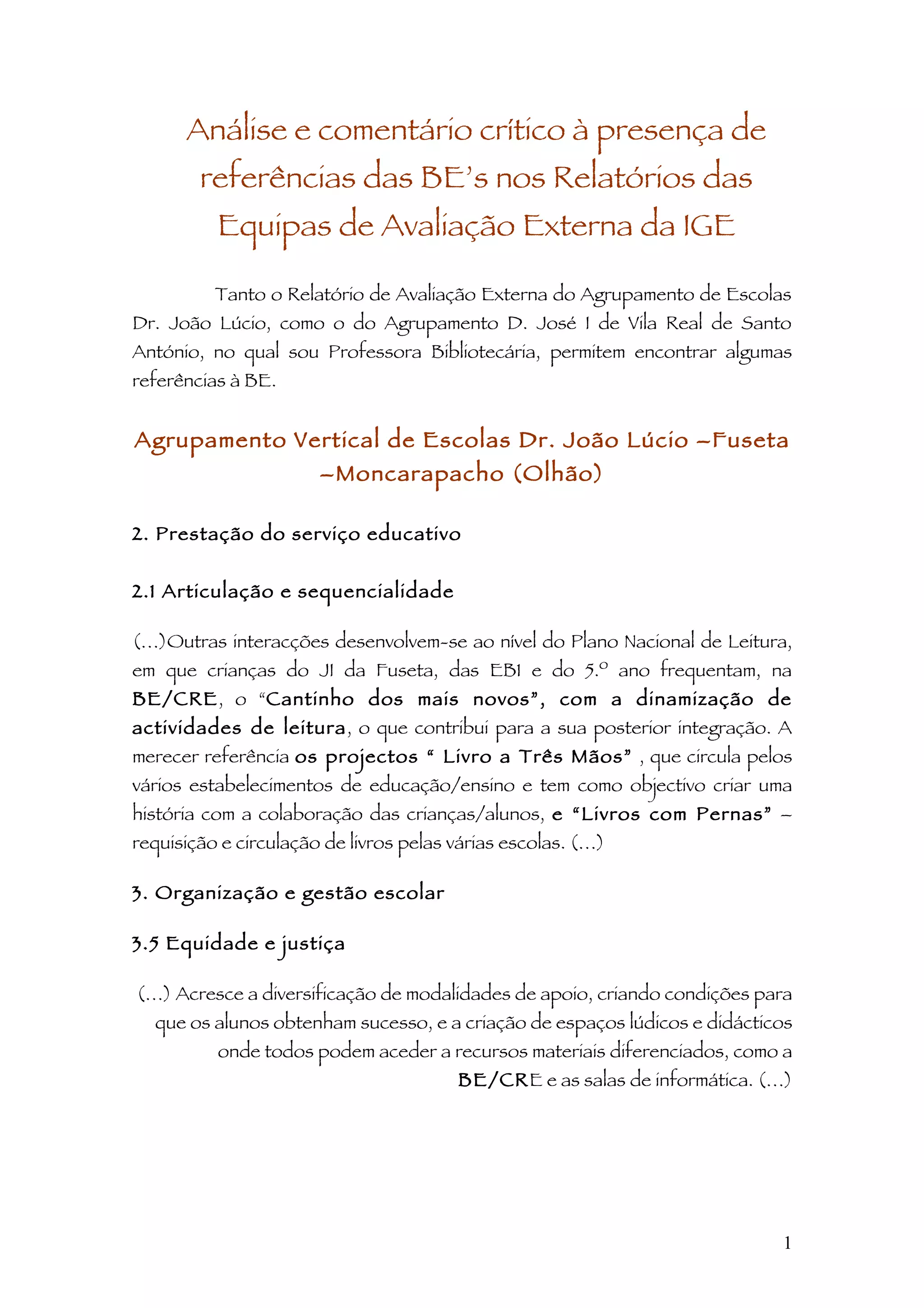 O documento analisa as referências às bibliotecas escolares (BE's) nos relatórios de avaliação externa de duas escolas. Encontrou mais referências à BE do agrupamento onde é professora bibliotecária. Conclui que a Inspeção-Geral da Educação deveria valorizar mais o papel das BE's na promoção do sucesso escolar.