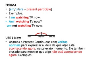 Este documento explica os usos do Presente Contínuo em inglês. Ele é usado para: 1) Expressar ações que estão acontecendo agora no momento; 2) Ações de longa duração em progresso agora; 3) Indicar ações que irão acontecer em um futuro próximo. Ele também expressa 4) Repetição e irritação com o uso de advérbios como "always" e "constantly". O documento fornece exemplos detalhados para cada um desses usos.