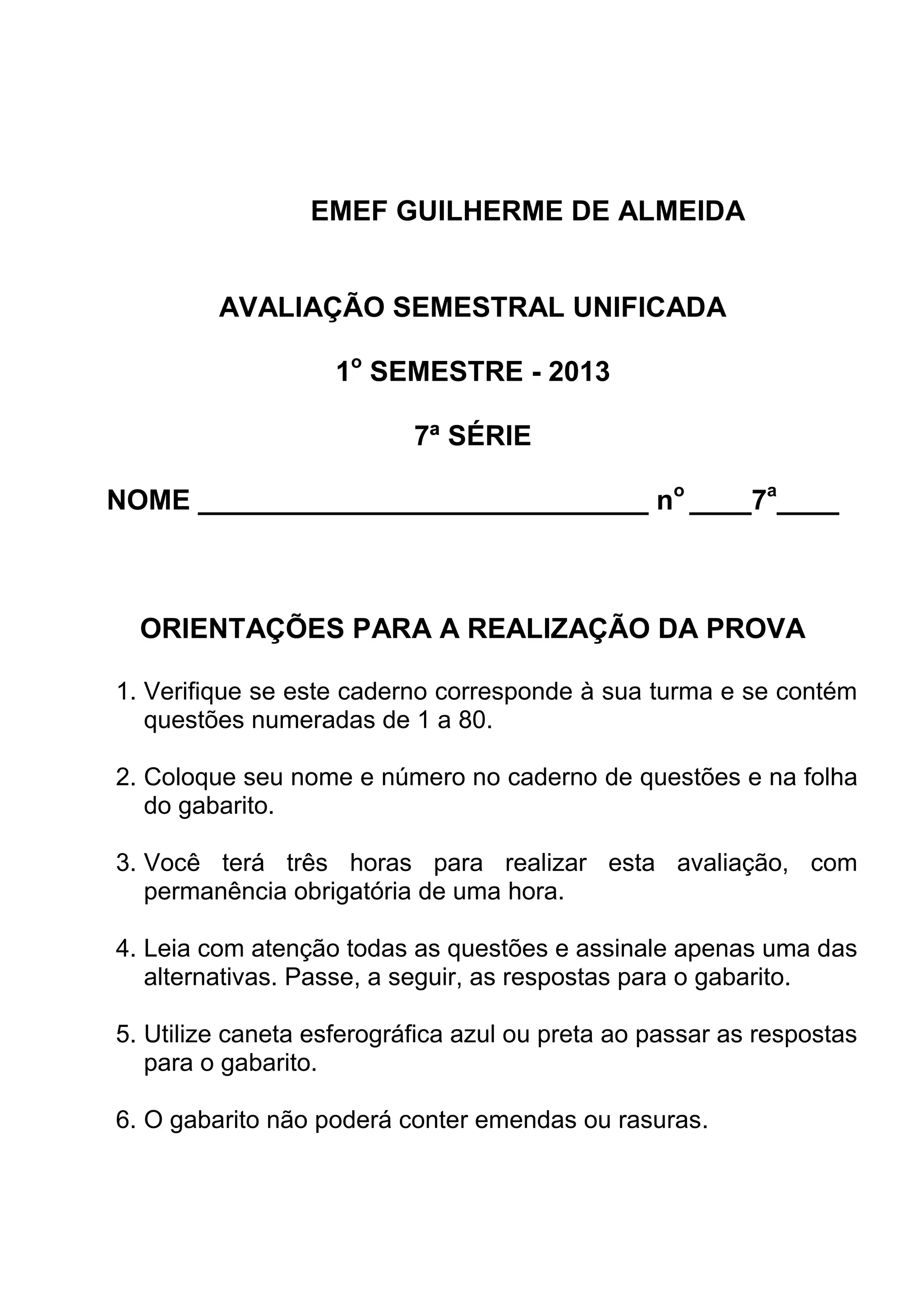 1. O documento fornece orientações para a realização de uma prova de avaliação semestral para alunos da 7a série, incluindo instruções como verificar se o caderno corresponde à turma, colocar nome e número, tempo de duração da prova, entre outras.