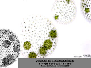 O documento descreve a evolução dos organismos unicelulares para organismos multicelulares, começando com as primeiras formas de vida unicelulares até os primeiros seres multicelulares. Detalha as hipóteses sobre a origem dos eucariontes e as vantagens da multicelularidade, como maior especialização celular e adaptação a diferentes ambientes.