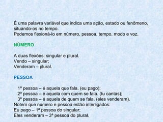 O documento discute os verbos em português, explicando suas flexões de número, pessoa, tempo, modo e voz. É detalhado os diferentes tempos verbais, modos e vozes, mostrando como os verbos podem ser flexionados de acordo com essas categorias gramaticais.