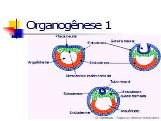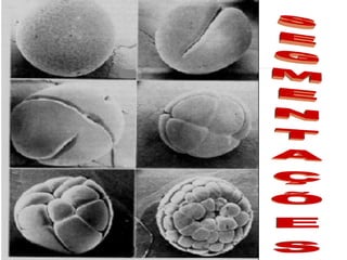 A embriologia estuda o desenvolvimento de embriões animais. O documento descreve os tipos de óvulos, as fases da segmentação e do desenvolvimento embrionário como a mórula, blástula e gastrulação. Detalha também o desenvolvimento embrionário humano desde a fecundação até o nascimento.