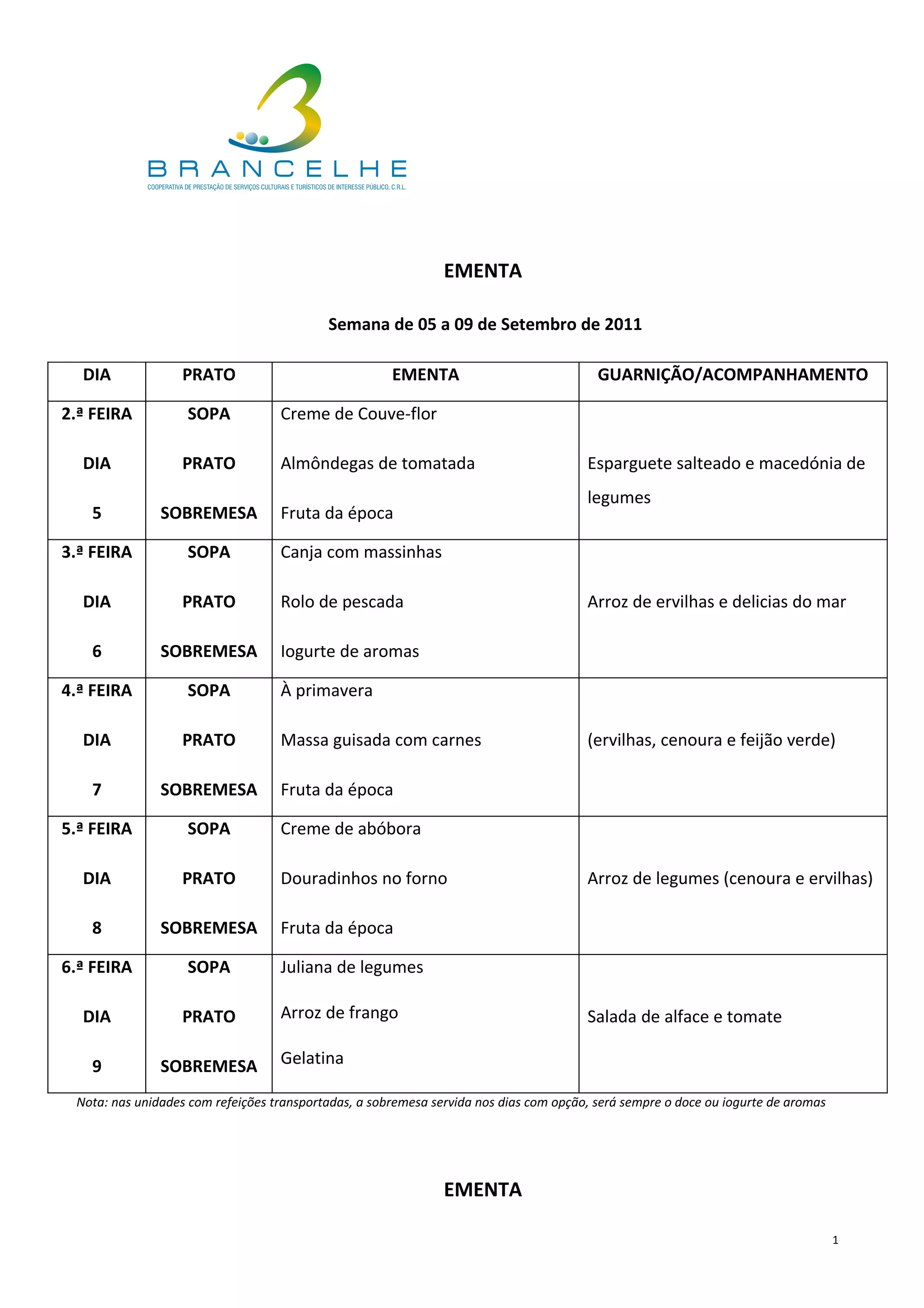 Este documento apresenta as ementas semanais de 5 a 9 de Setembro e de 12 a 16 de Setembro de 2011, incluindo a sopa, prato principal e sobremesa servidos cada dia, assim como os acompanhamentos. As refeições variam diariamente e incluem pratos como almôndegas de tomatada, rolo de pescada e feijoada à portuguesa.