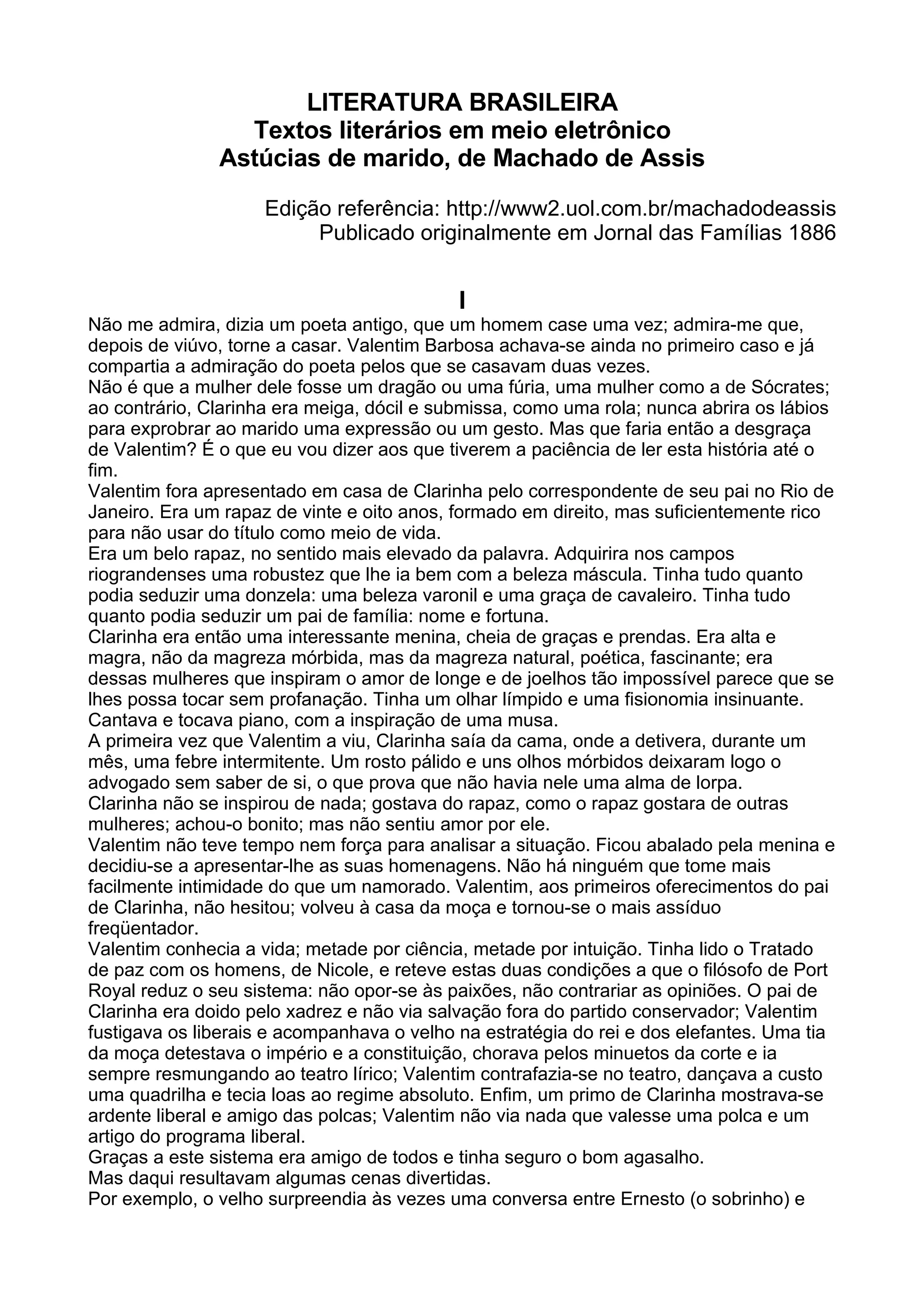 Este documento resume o primeiro capítulo do conto "Astúcias de marido", de Machado de Assis. Apresenta os personagens principais: Valentim Barbosa, um rico advogado que se apaixona por Clarinha, filha de um amigo de seu pai; e Ernesto, primo de Clarinha que já a ama há anos. Conta como Valentim conquista a confiança da família de Clarinha, mas ela ama secretamente Ernesto.
