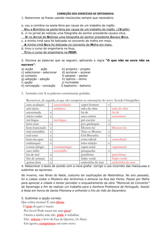 Este documento apresenta um conjunto de exercícios de ortografia com diferentes tarefas como reescrever frases usando maiúsculas corretamente, aplicar a regra "o que não se ouve não se escreve", assinalar palavras grafadas corretamente de acordo com o novo acordo ortográfico, reescrever um texto corrigindo erros de ortografia e escolher opções corretas.