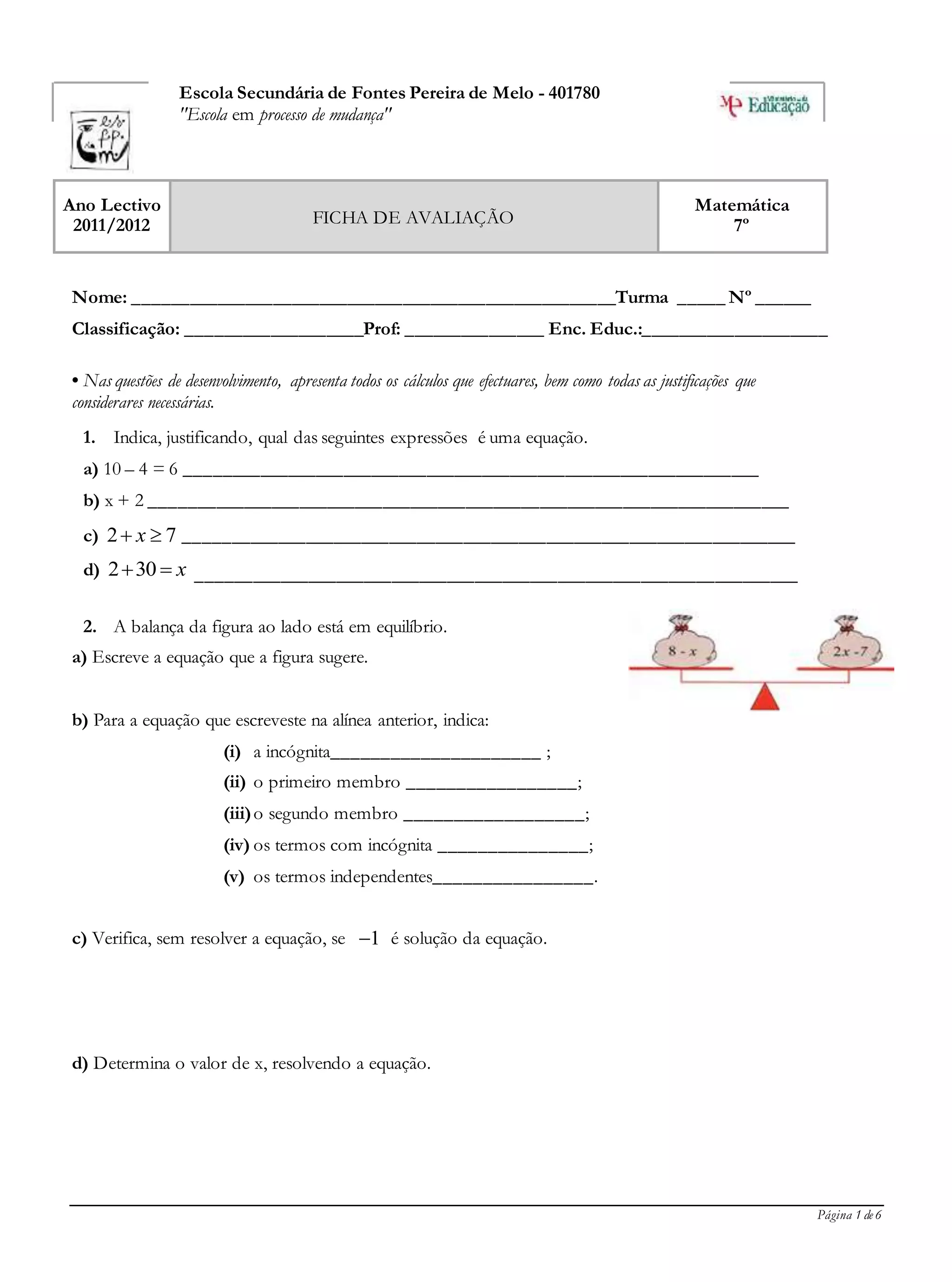 Este documento contém uma avaliação de matemática para alunos do 7o ano. A avaliação inclui nove questões sobre equações, álgebra, geometria e estatística. As questões pedem aos alunos que resolvam problemas, interpretem gráficos e diagramas, e calculem medidas estatísticas.