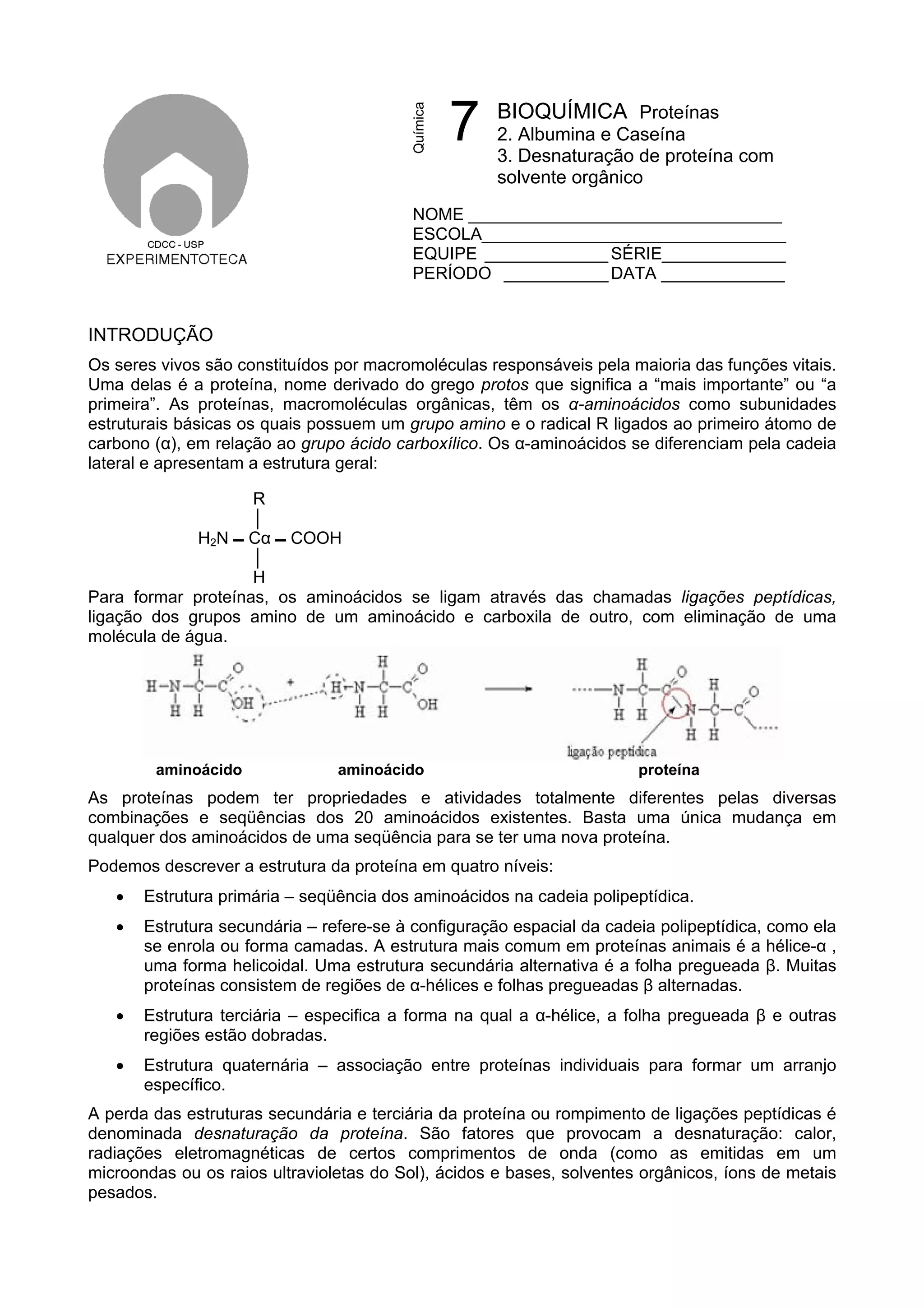 O documento discute as proteínas, incluindo sua estrutura e funções. Ele descreve como a albumina no ovo e a caseína no leite coagulam quando em contato com ácido acético, demonstrando a presença de proteínas. Também mostra como a albumina é desnaturada quando em contato com álcool etílico, perdendo sua estrutura terciária.