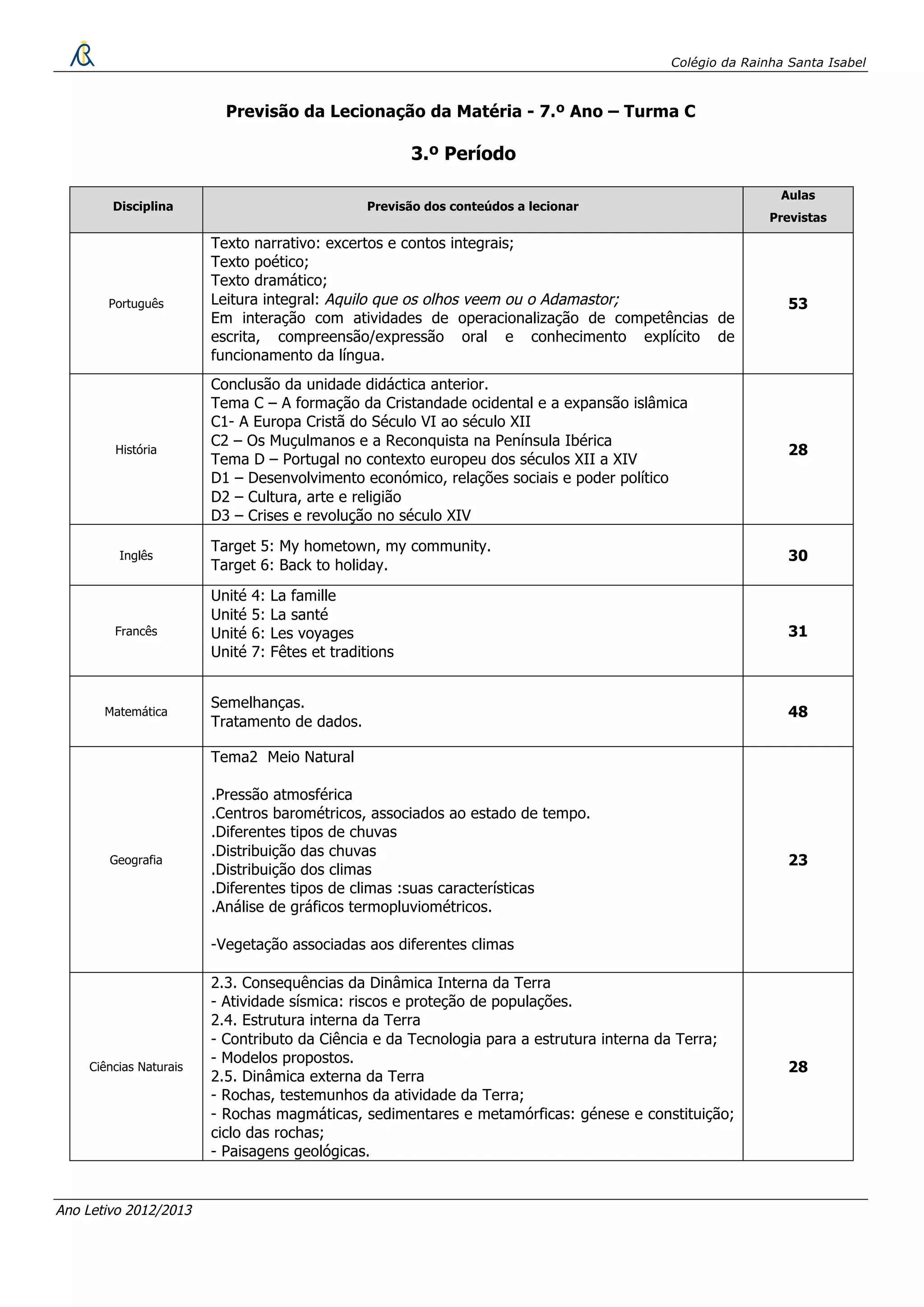 Este documento fornece um plano de ensino para o 3o período letivo de 2012/2013 para a turma C do 7o ano do Colégio da Rainha Santa Isabel, listando as disciplinas, os conteúdos planejados e o número de aulas previstas para cada matéria.