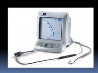 O documento aborda a odontometria, que envolve a medição do comprimento do dente em endodontia, utilizando várias técnicas como tátil, radiográfica e eletrônica. Destaca a importância de referências anatômicas para obter medidas precisas e evita complicações pós-operatórias. Além disso, discute a técnica de Ingle para medir o dente radiograficamente e ajustar a medida para compensar distorções.