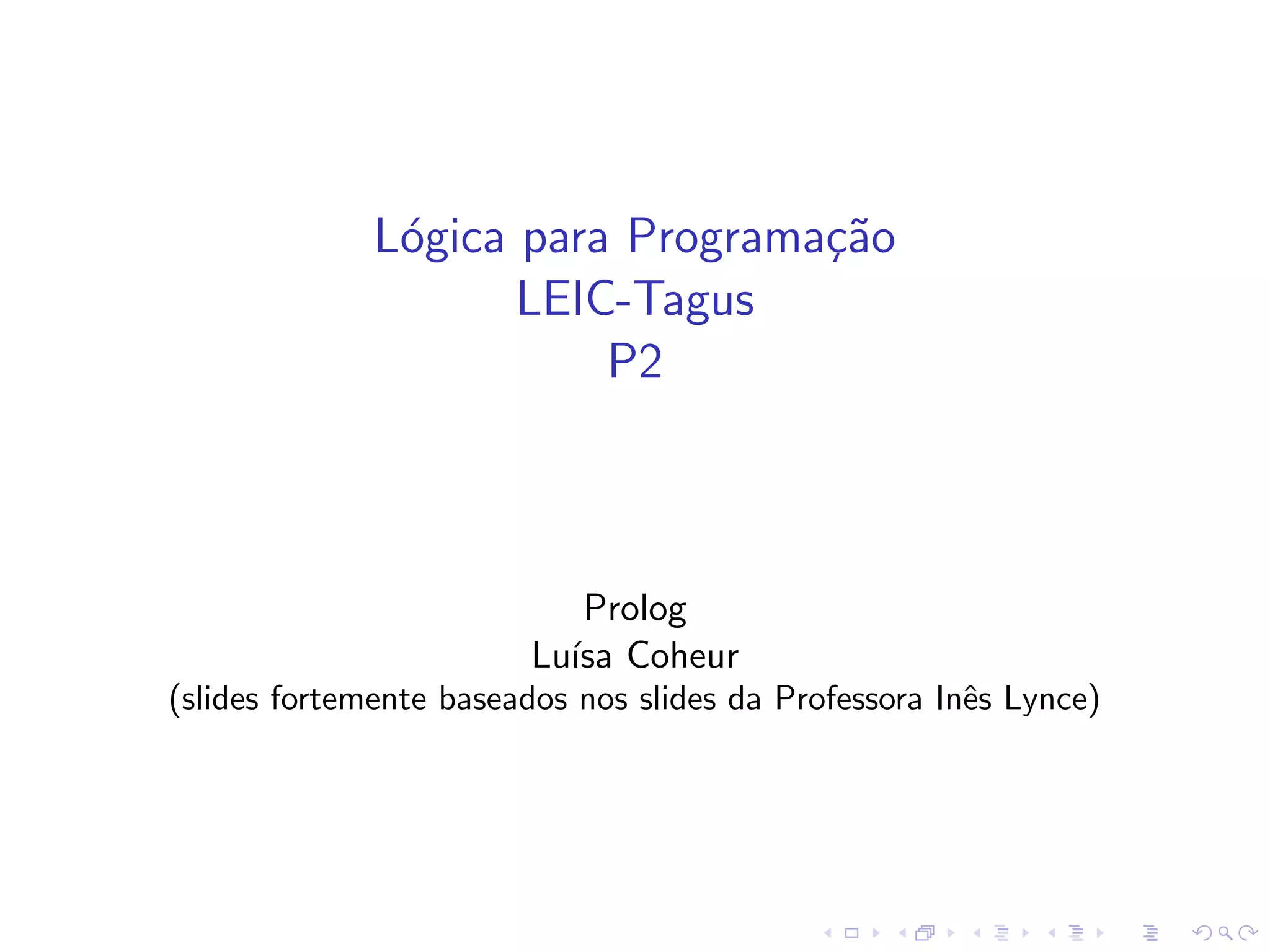 O documento apresenta o programa para o curso de Lógica para Programação em Prolog, cobrindo conceitos básicos, lógica proposicional e de primeira ordem usando sistemas dedutivos e de resolução, programação lógica e Prolog, e exemplos iniciais. Os tópicos incluem sintaxe de Prolog, unificação, comparação e expressões aritméticas de termos, listas, leitura e escrita de termos.